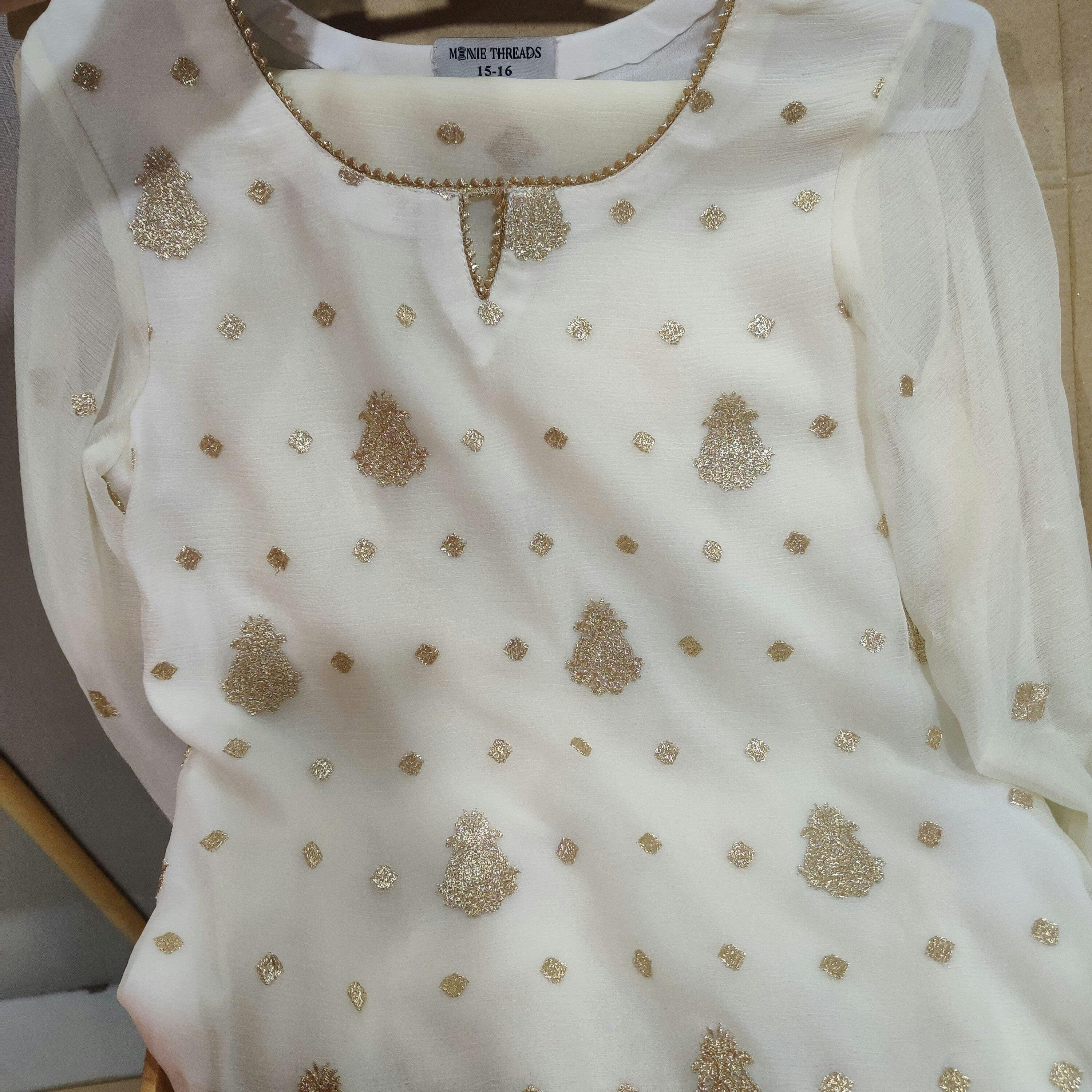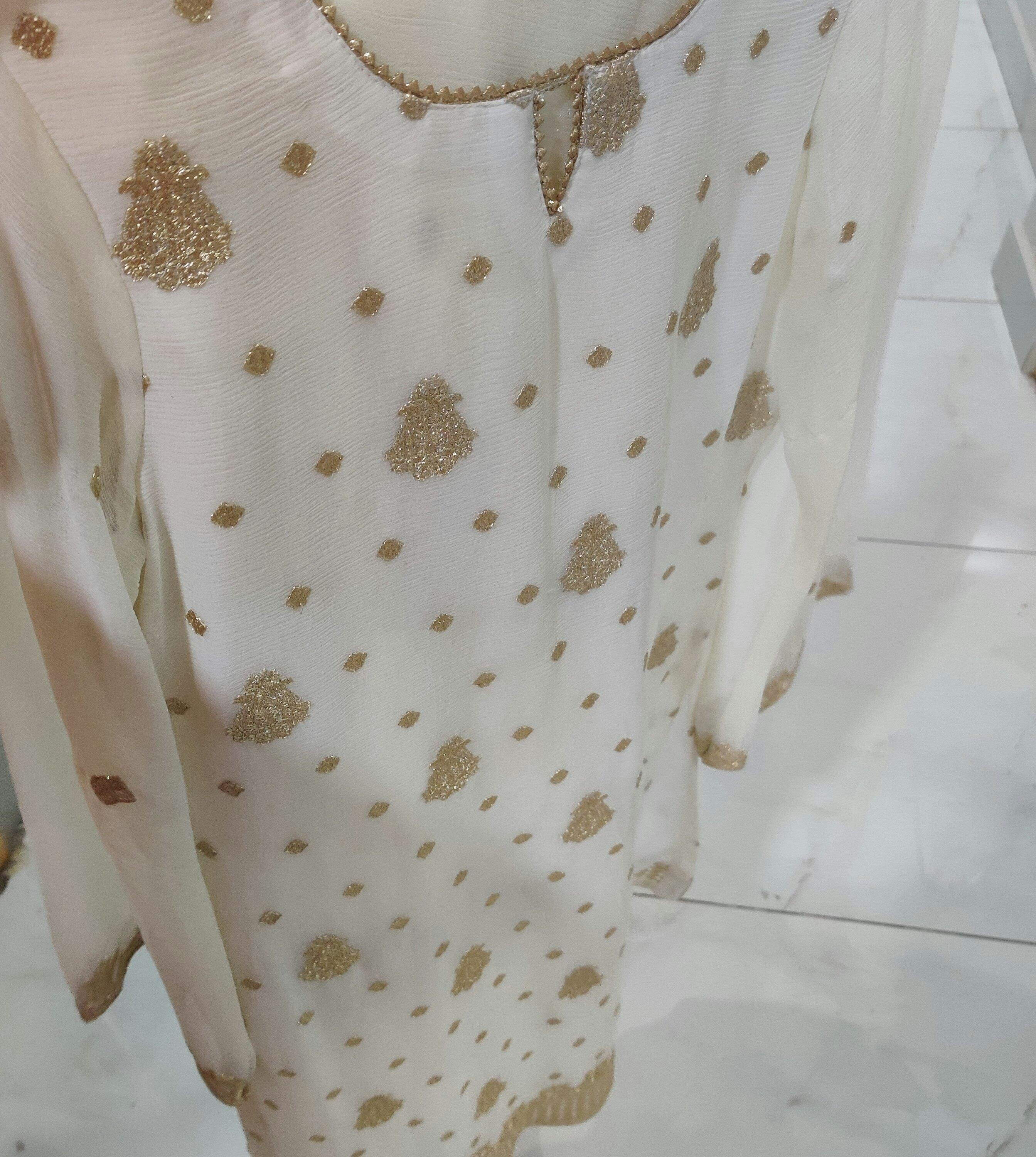 Dilan is a timelessly elegant ensemble featuring an ash white chiffon kurti delicately adorned with gold thread embroidery across the sleeves and body, finished with a heavily embroidered gold daaman that adds richness and grace. It is paired with a bronze silk sharara, providing structure and contrast. A matching ash white chiffon dupatta with gold embroidery on the borders completes this regal look?ideal for classic festive events and wedding soirées.