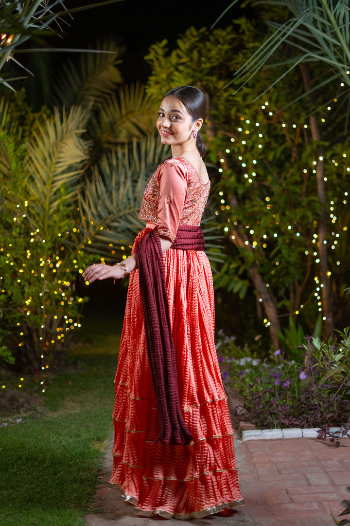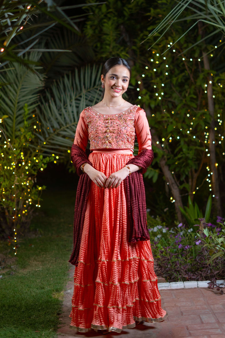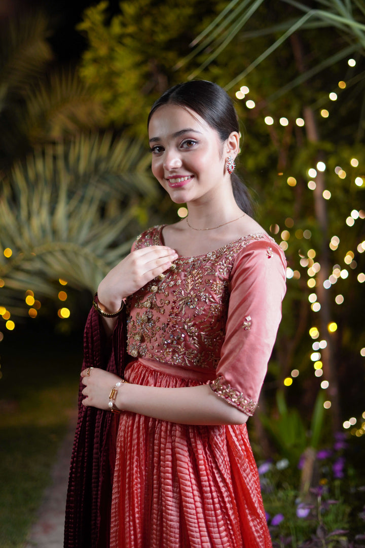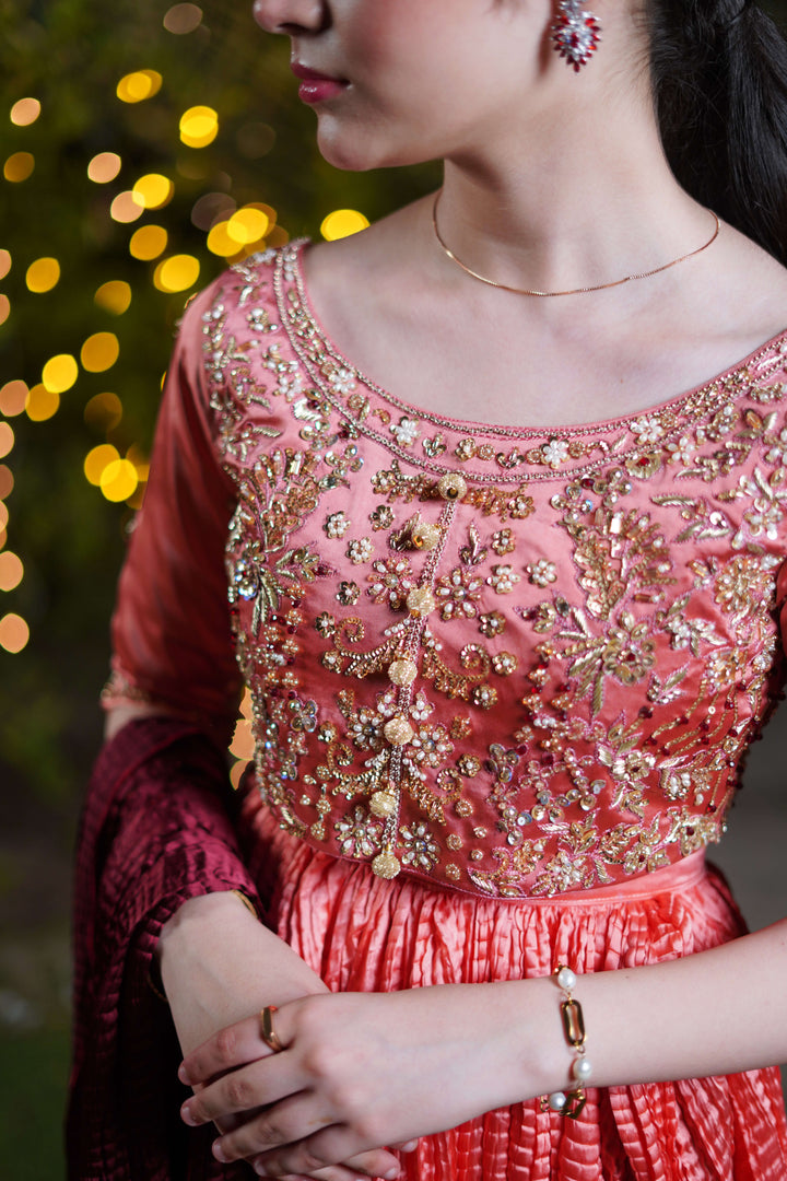 Dilrüba is a celebration of timeless grandeur. The pink choli, crafted from imported silk, is intricately adorned with light gold and champagne adda work on both front and back. A crystal-lined front with champagne-toned shimmery buttons adds a royal touch, while elbow-length sleeves offer a graceful silhouette. It is paired with a crushed lehenga in the same pink hue and a plain red crushed dupatta for a complete regal look.
