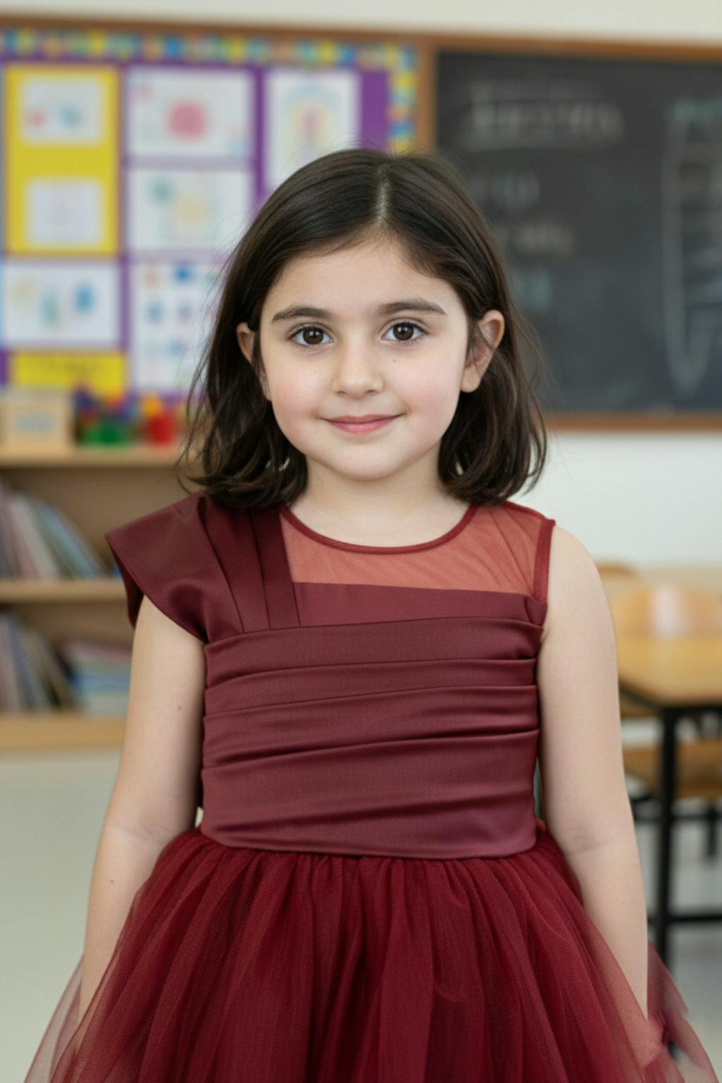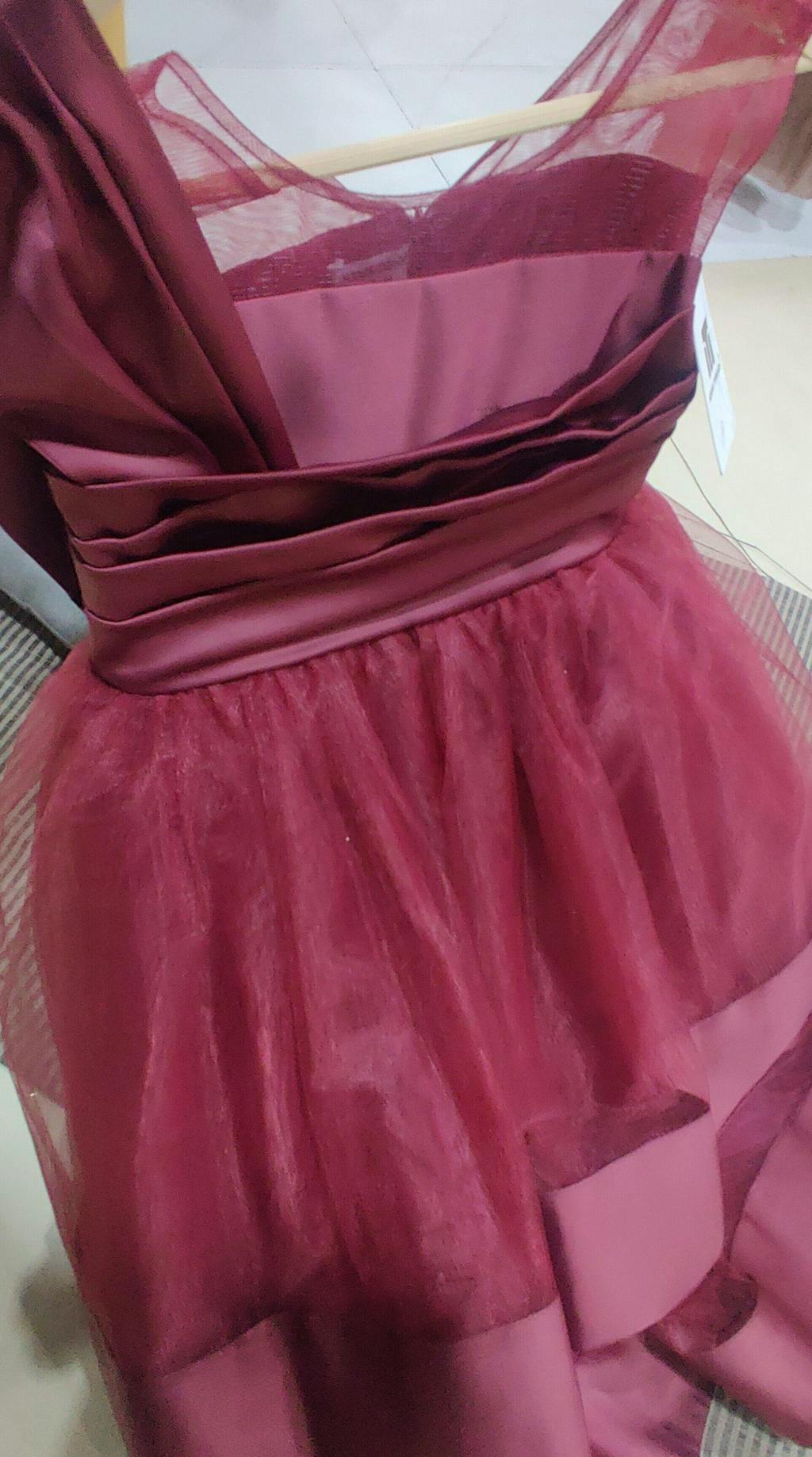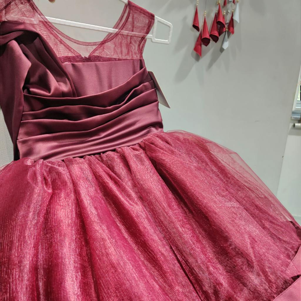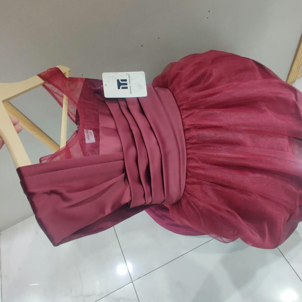 Description: A maroon sleeveless frock with a voluminous net-layered skirt and sleek silk accents, perfect for weddings and formal occasions.