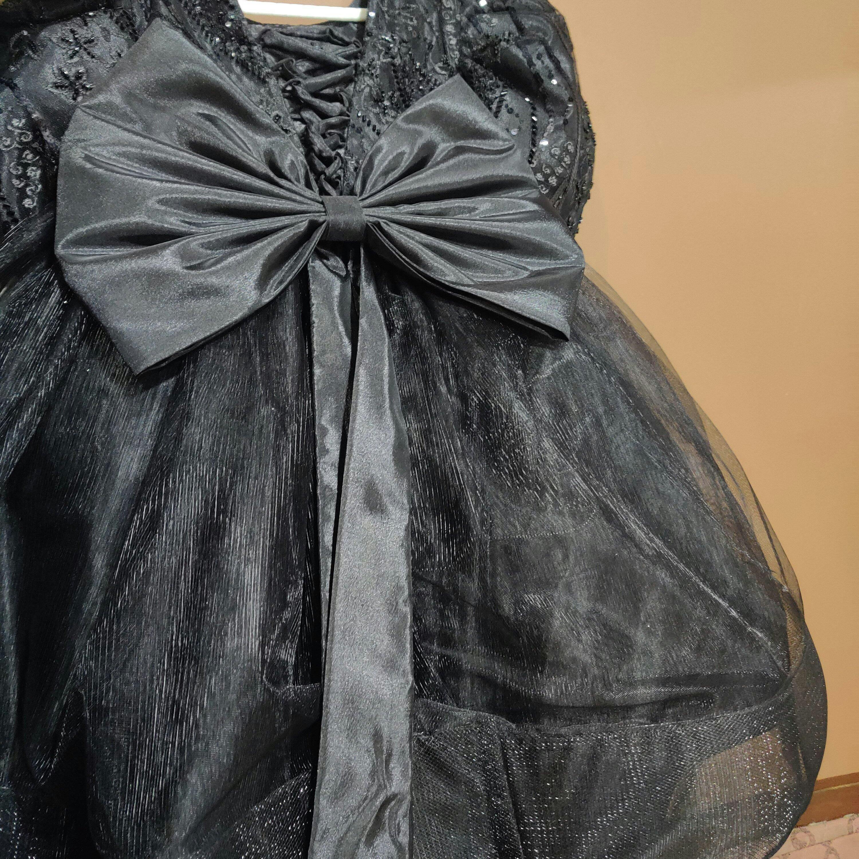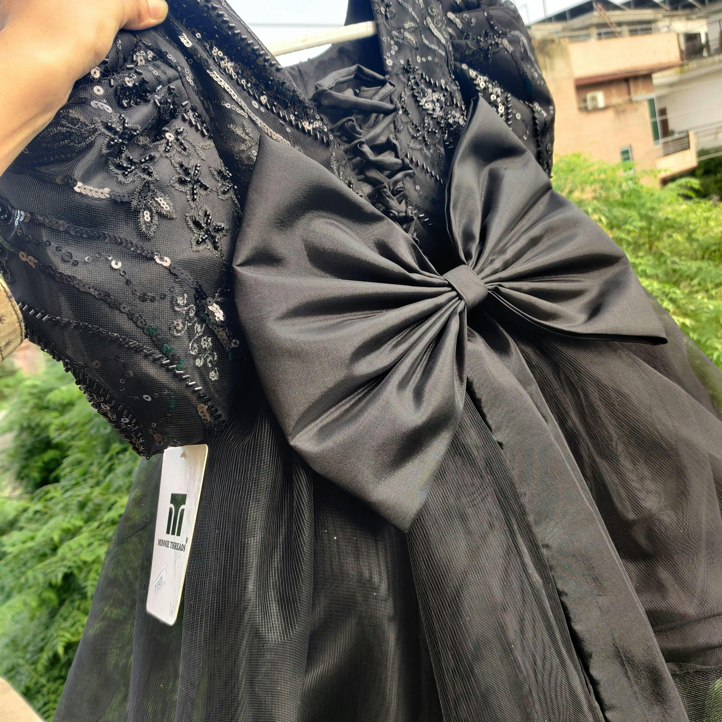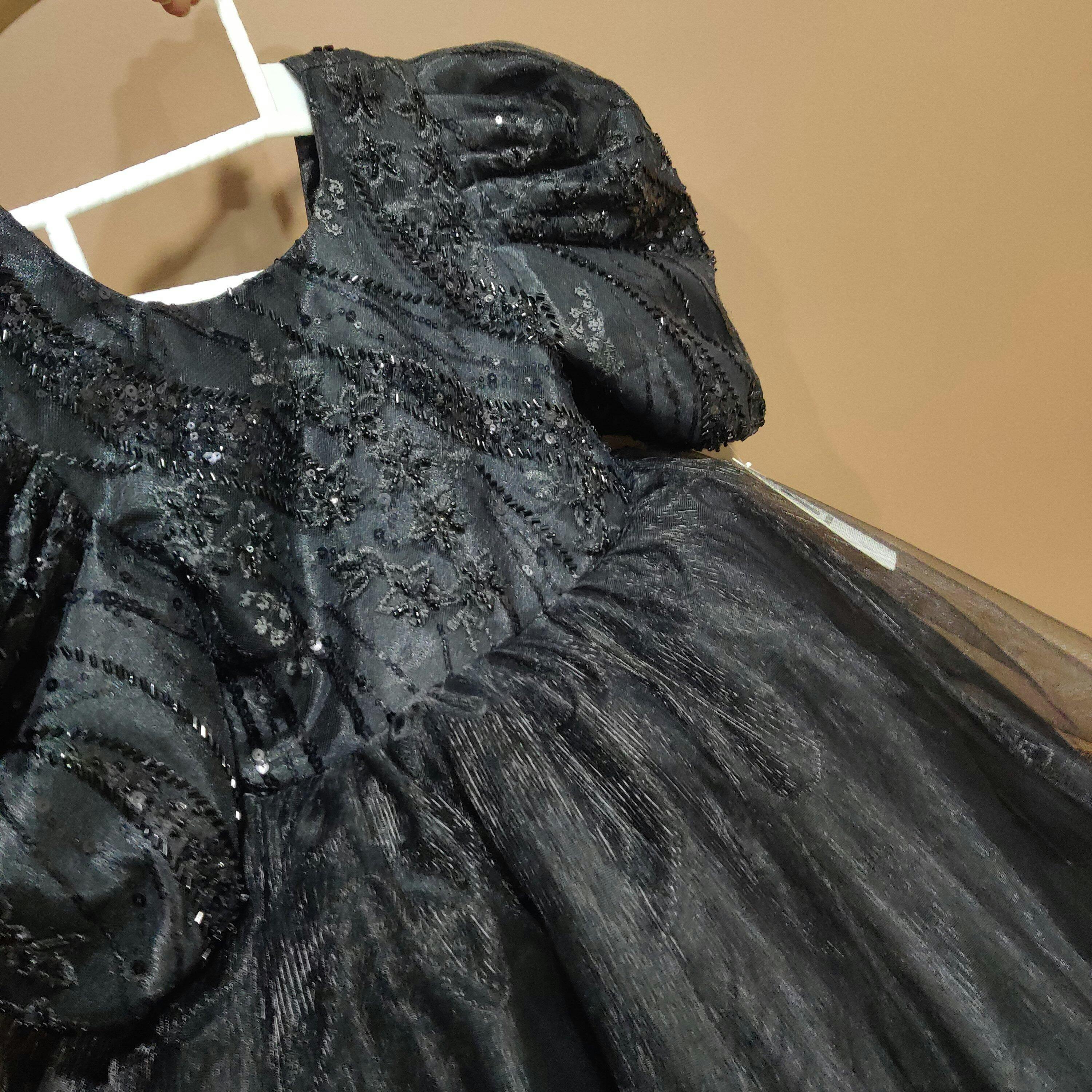 Description: A black net frock with intricate cut daana bodice, bell sleeves, and a voluminous can-can skirt, lined with soft silk for comfort. Perfect for formal events and special occasions.