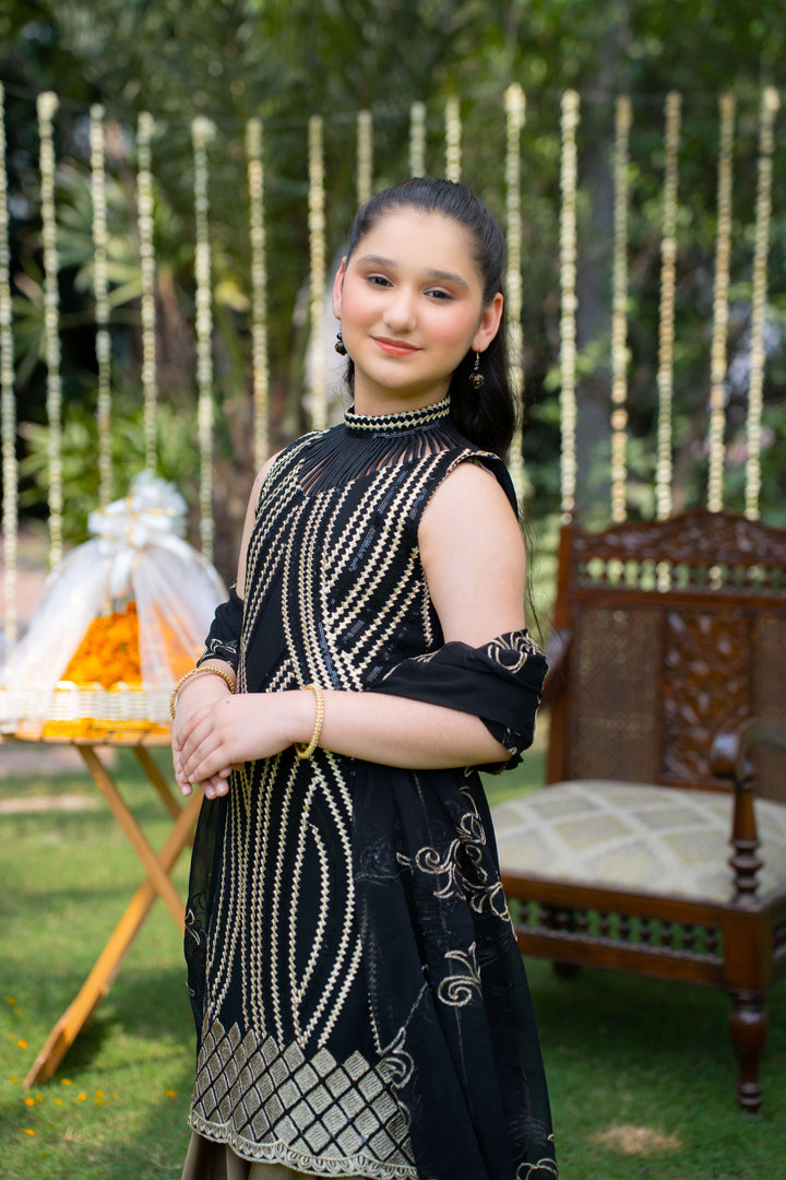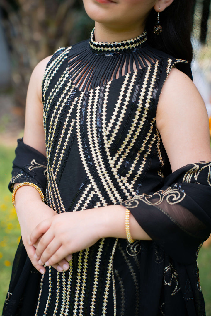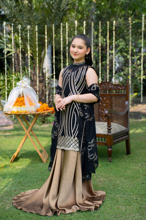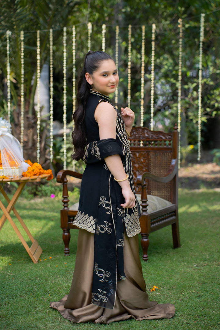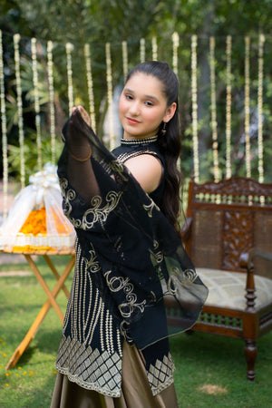 Elegant black chiffon kurti adorned with intricate gold thread embroidery on the bodice and hem, paired with a flowy bronze silk sharara. The look is completed with a matching chiffon dupatta featuring delicate gold thread embroidery. A perfect pick for weddings and traditional festivities.