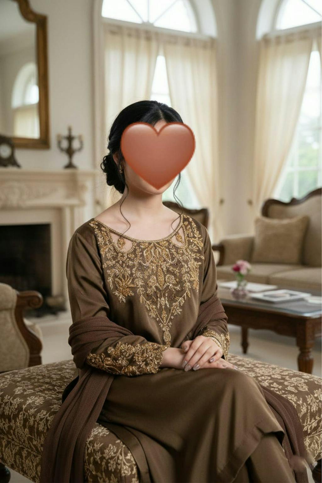 Shirt: A breathtaking smoky brown Korean silk long shirt featuring an intricately scalloped neckline embellished with heavy gold adda work. The front neckline radiates opulence with dense dabka detailing, while the back neckline and daaman are richly adorned with handcrafted flowery adda bails. The pointed sleeves elevate the grandeur, embellished along all edges with dabka, naqshi, and stone work in antique gold tones—a perfect blend of traditional artistry and regal sophistication.