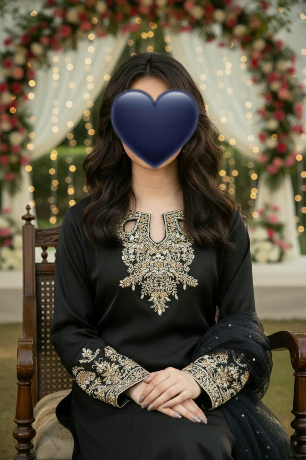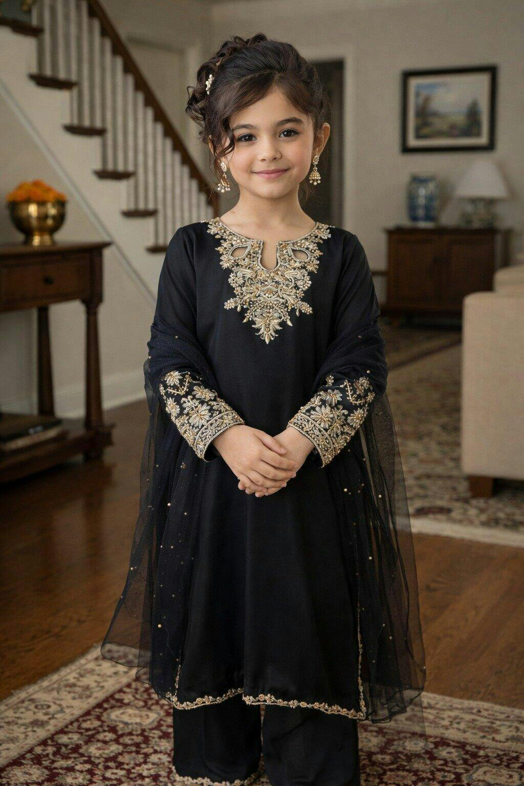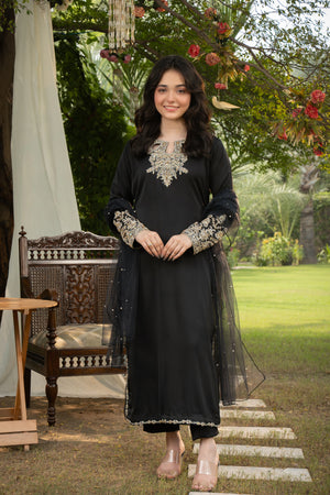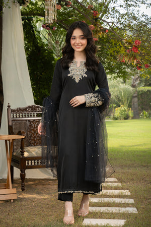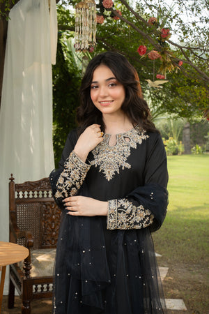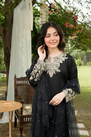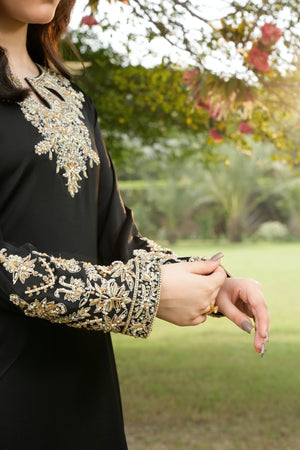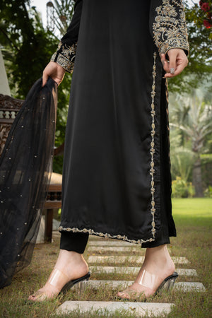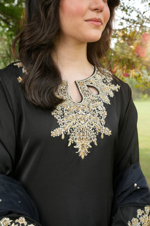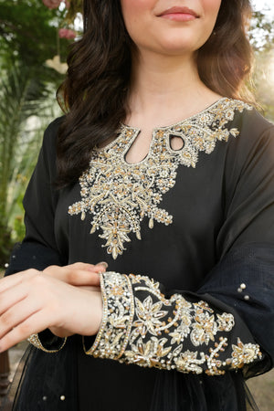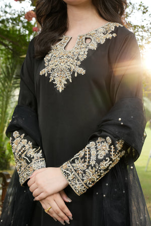 A timeless charcoal creation, exuding grace through its handcrafted adda work and subtle crystal radiance. The looped round-cut neckline adds a classic charm, complemented by a soft pearl-dusted dupatta — making it ideal for elegant evening festivities.