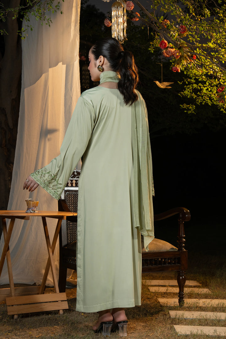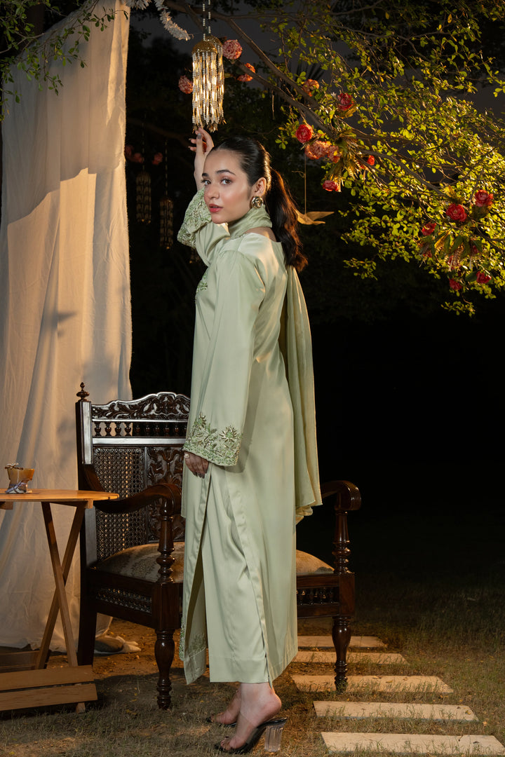 A refreshing lime ensemble with tone-on-tone handcrafted adda work — perfect for festive occasions, daytime events, and formal celebrations.
