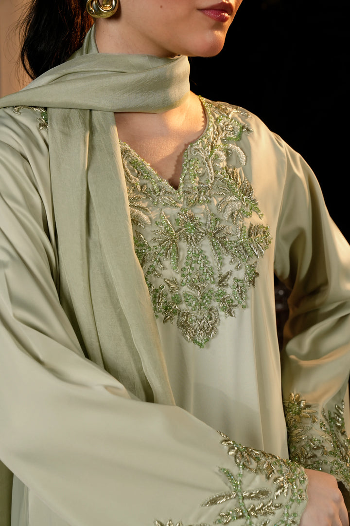 Shirt: A stunning lime Korean silk long shirt featuring intricate adda work in a slightly deeper lime shade. The round neckline is accentuated with U-shaped adda detailing, while the daaman and bell sleeves are heavily adorned with matching dabka, salma, and stone work, creating a sophisticated monochrome look.