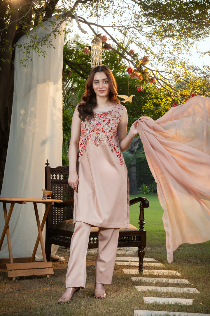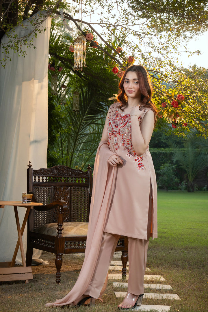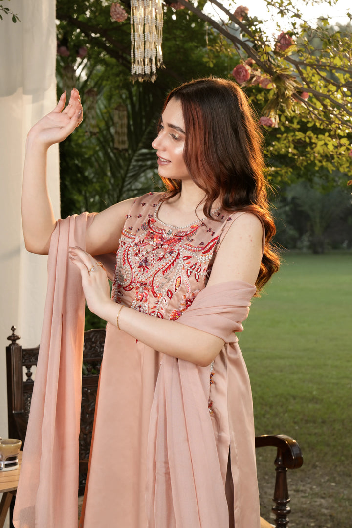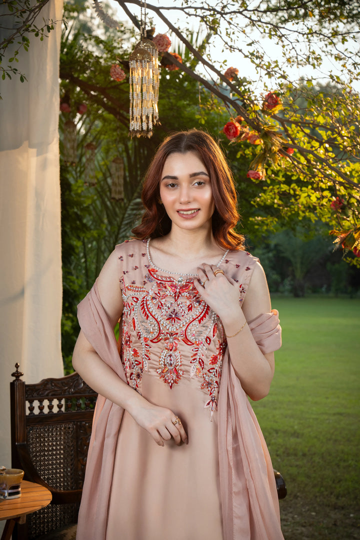 A chic rose gold ensemble featuring a rounded neckline and sleeveless silhouette, elevated with red pearl and crystal detailing. Paired with a contrasting red chiffon dupatta, it’s perfect for festive gatherings and formal celebrations.