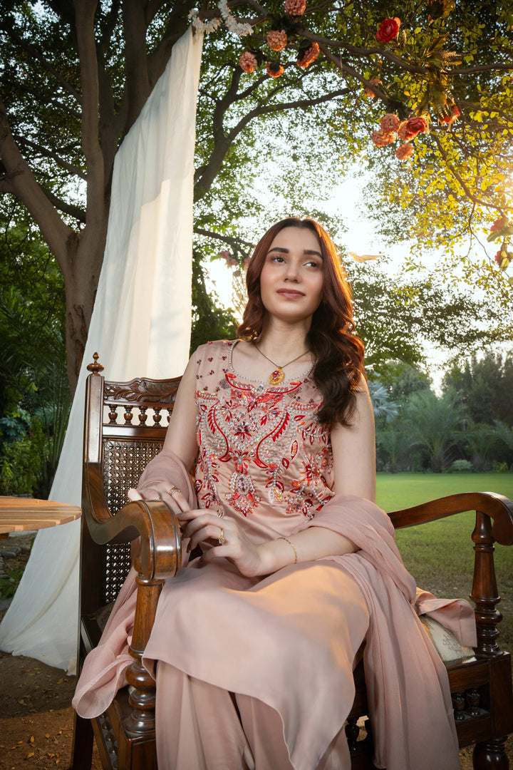 Dupatta: Rose Gold Pure Chiffon Dupatta, adding vibrance and sophistication to the look