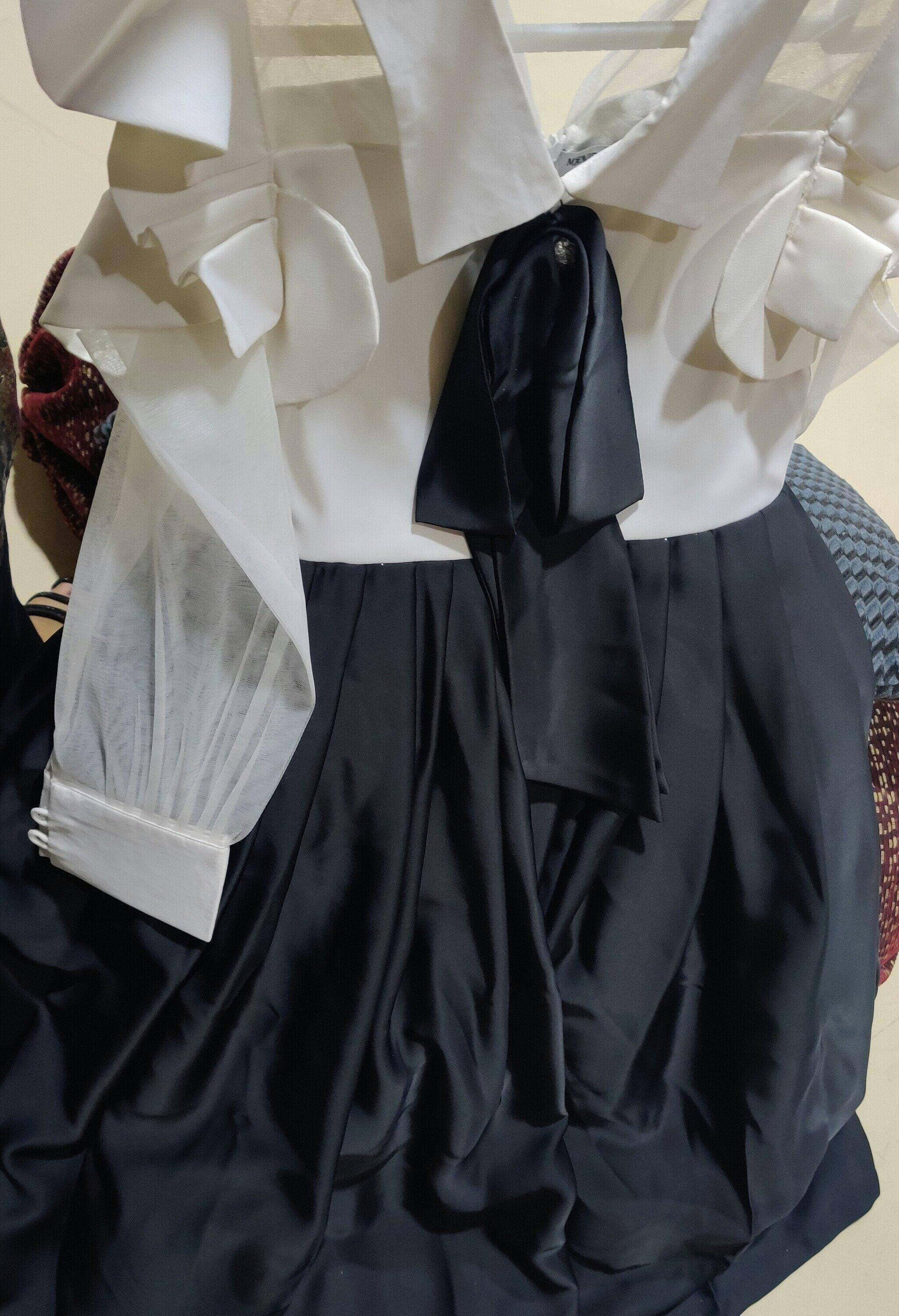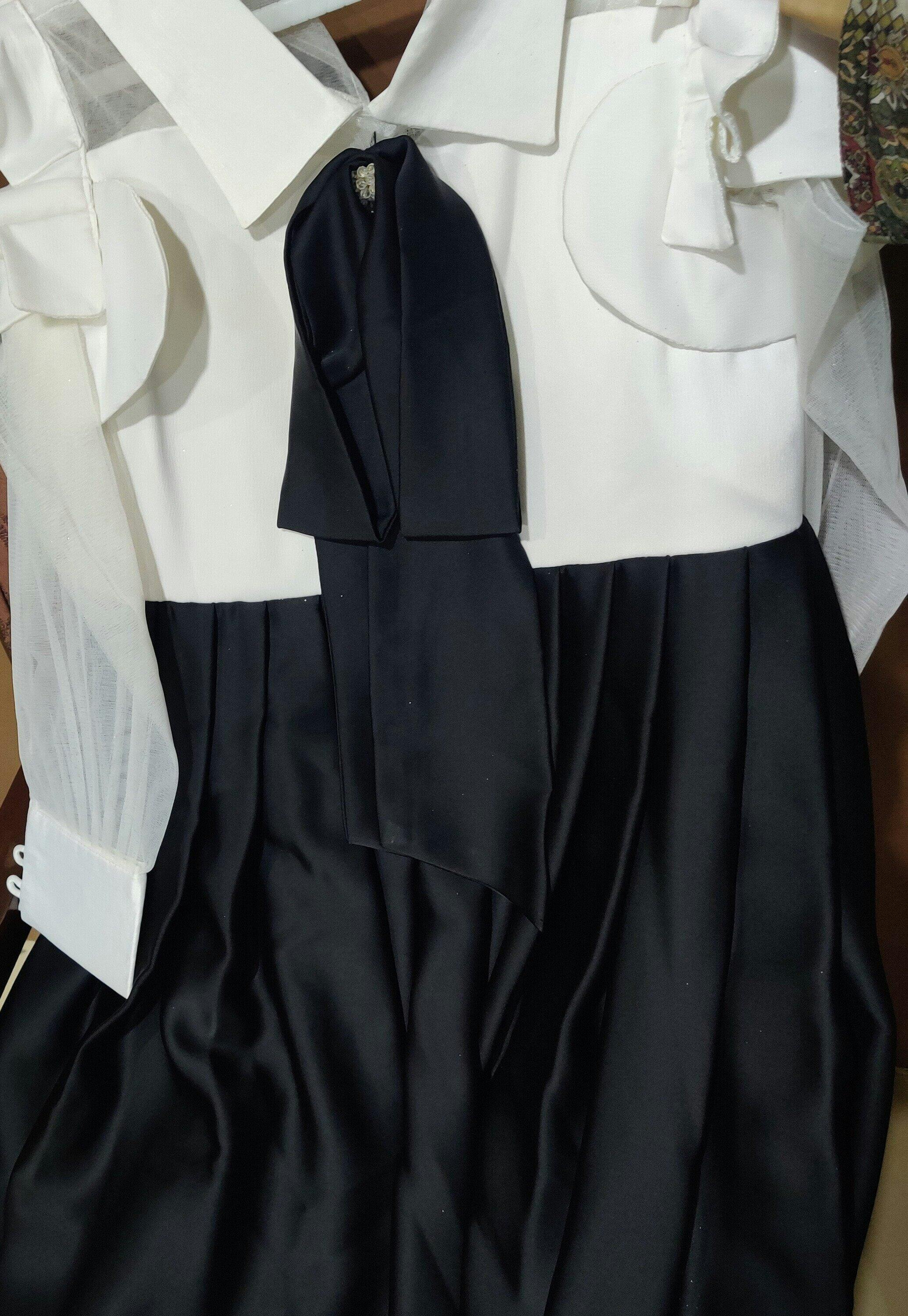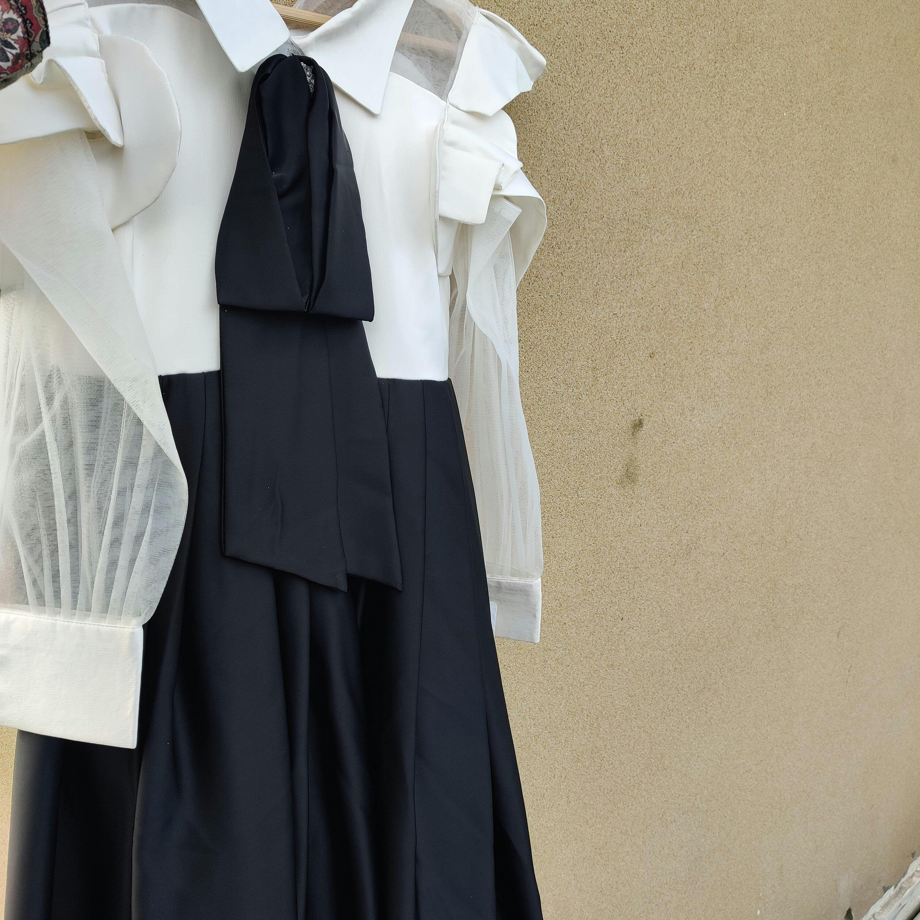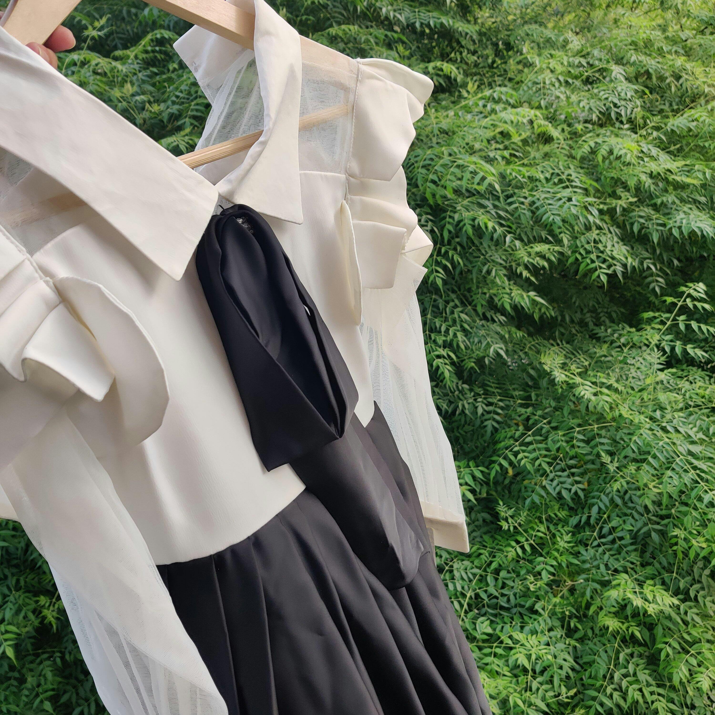 Description: Elegant black and white premium silk top with sheer net sleeves, classic collar, and front bow—ideal for formal and upscale occasions.