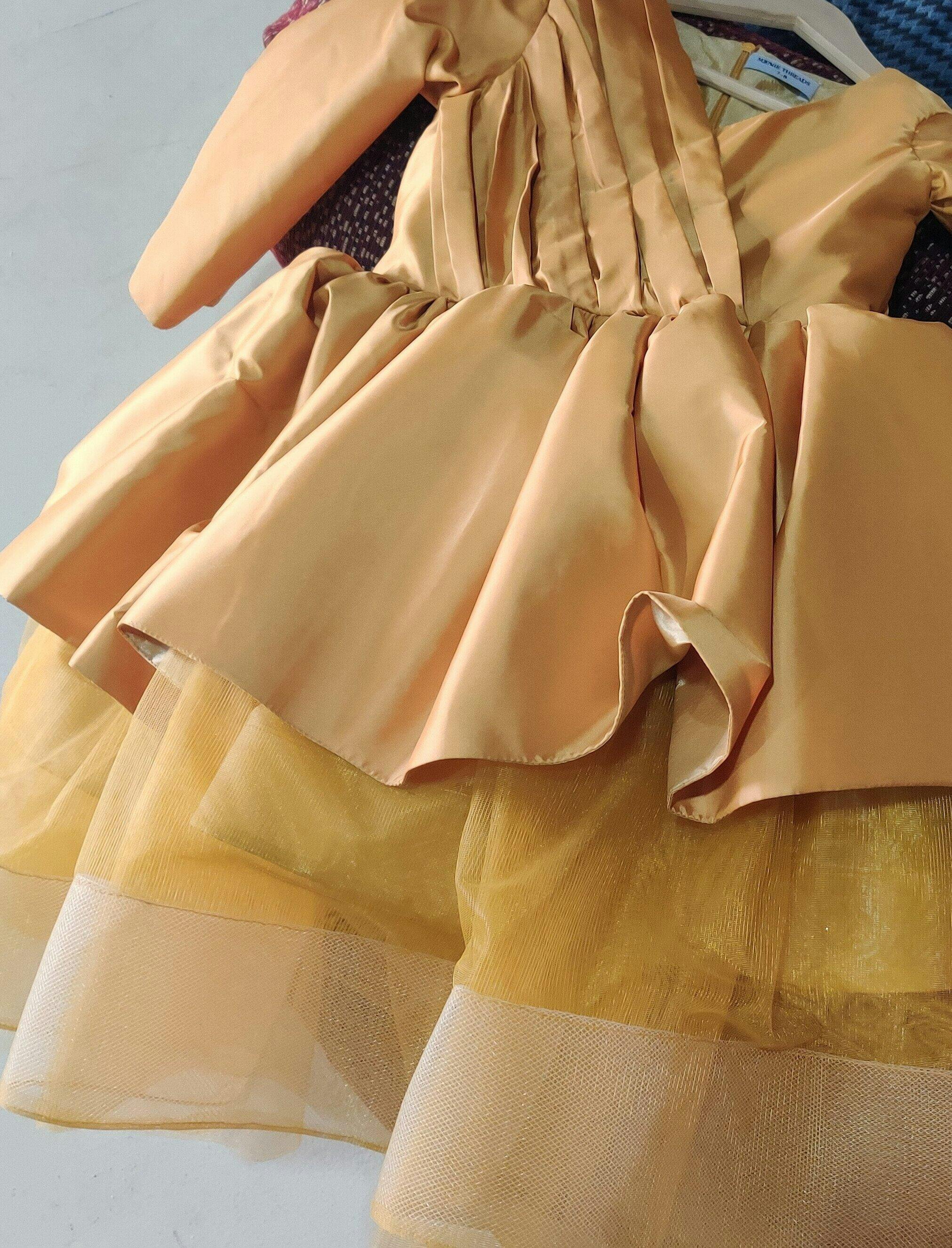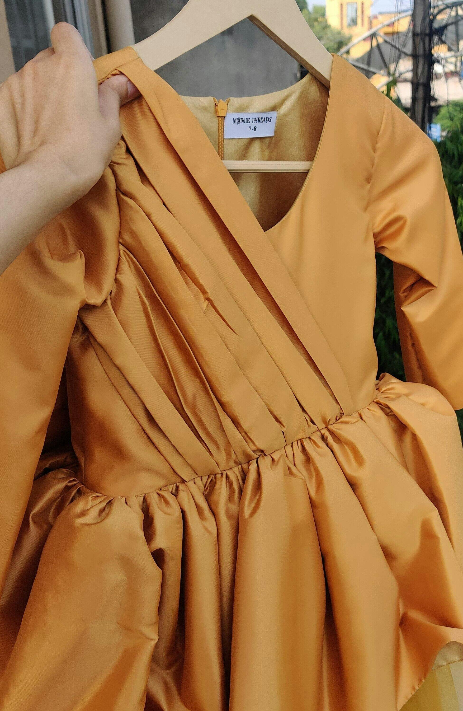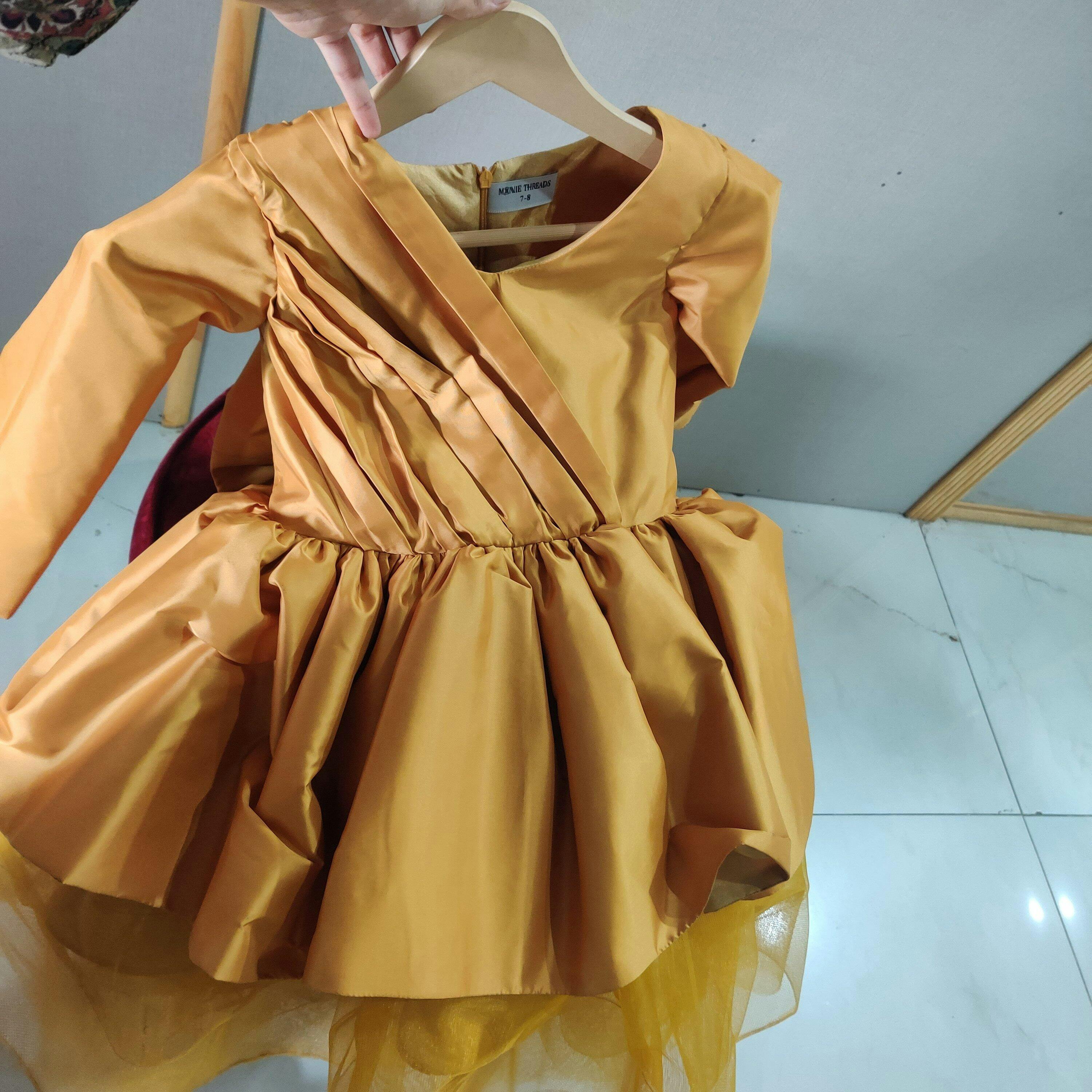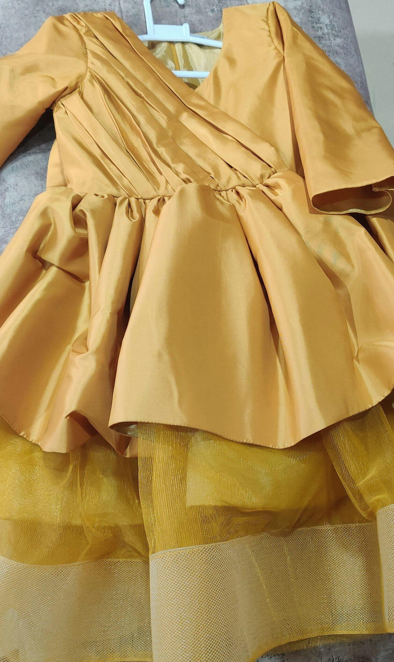 Description: A mustard gold frock featuring a wrap-style silk bodice and voluminous layered net skirt with soft silk lining. Perfect for weddings and festive occasions.