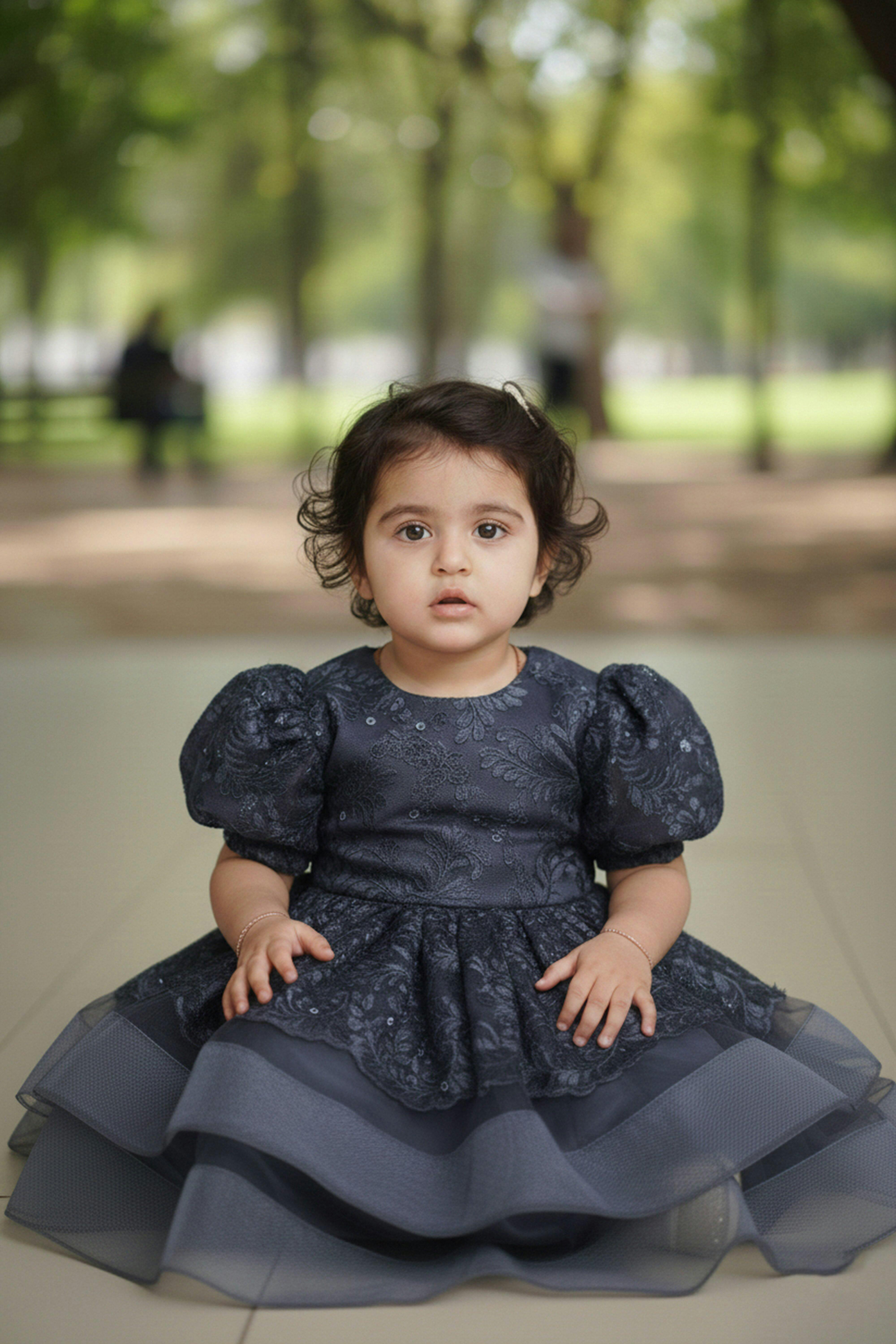 Description: A Navy Blue embroidered net frock with puff sleeves, layered tulle skirt, and soft silk lining—ideal for birthdays and special celebrations.