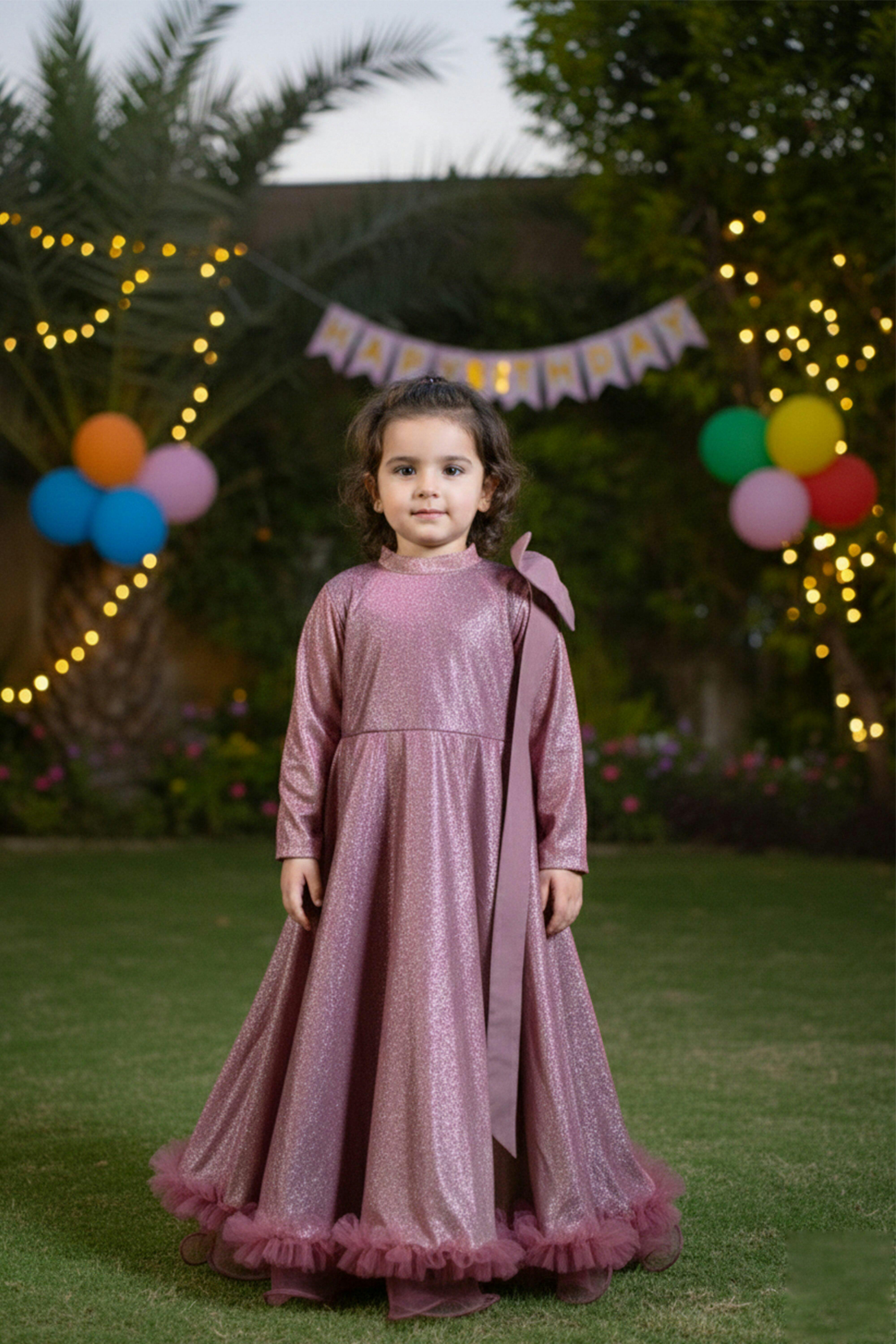 Description: A shimmering moonlight gown in ombre rose pink and off white, featuring a statement bow on the sleeve and delicate net frill at the hem. Designed in a flared silhouette with soft silk lining for added comfort—perfect for formal occasions.