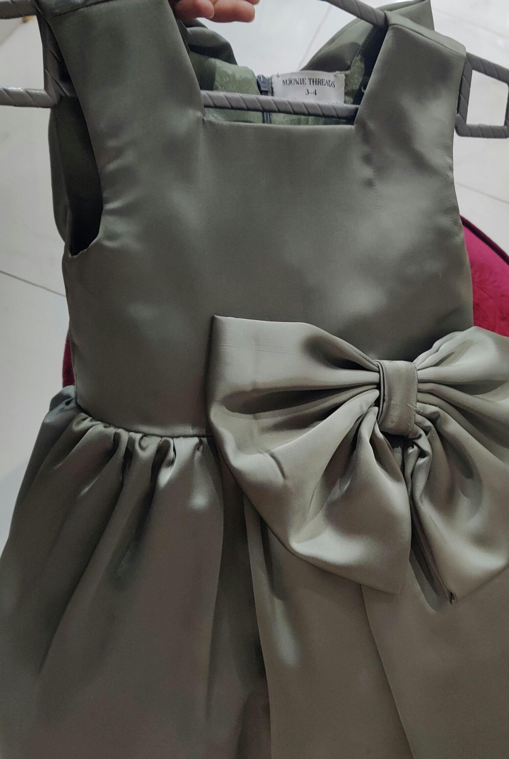 Description: A grey premium silk gown with puffed sleeves, front and back bows, and a gathered waist. Perfect for formal and semi-formal occasions.
