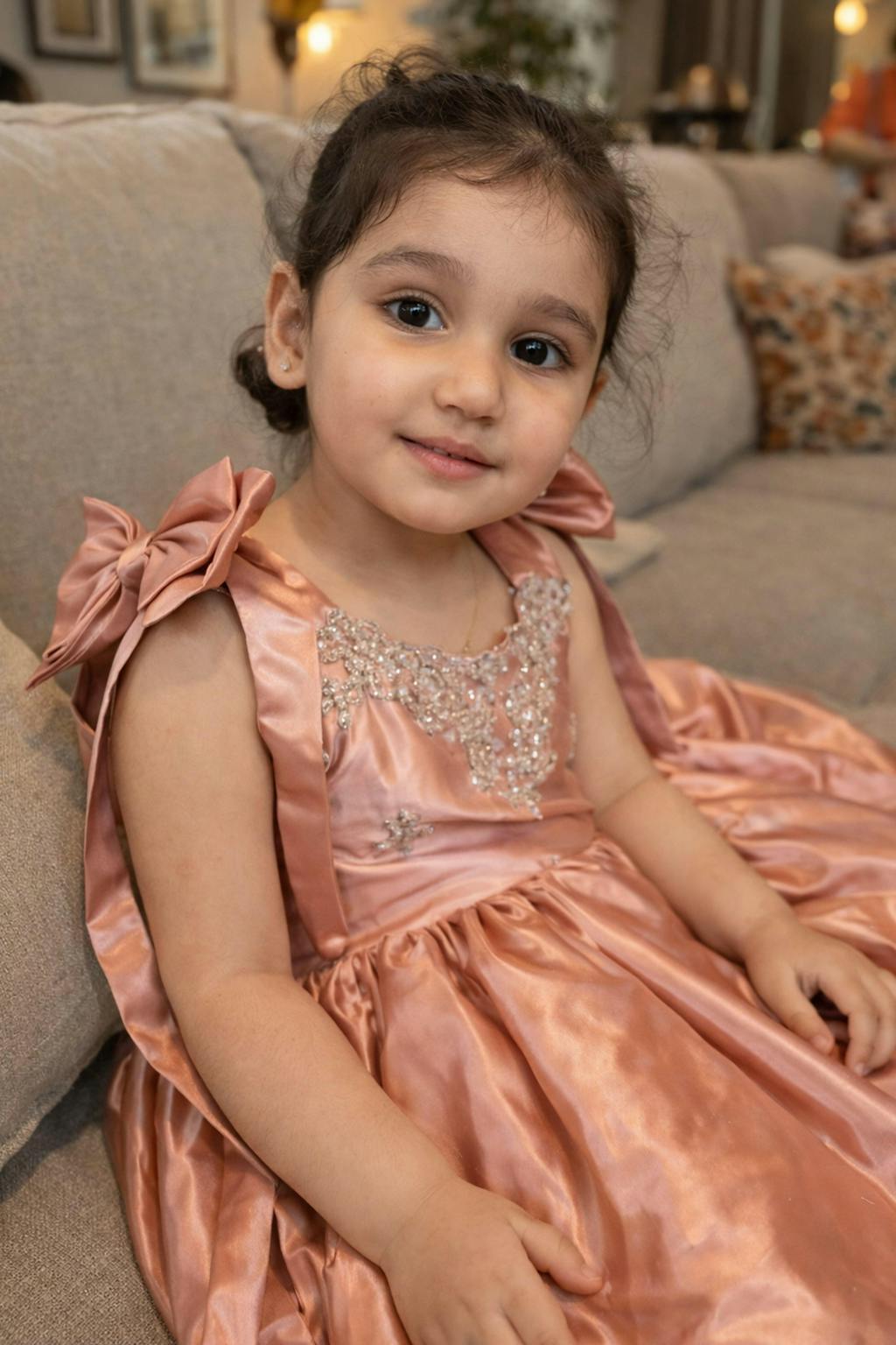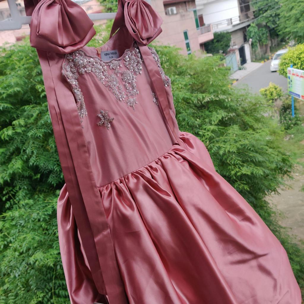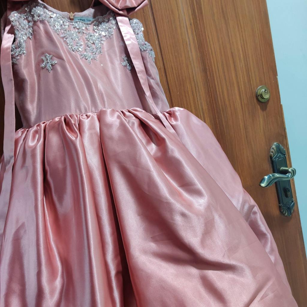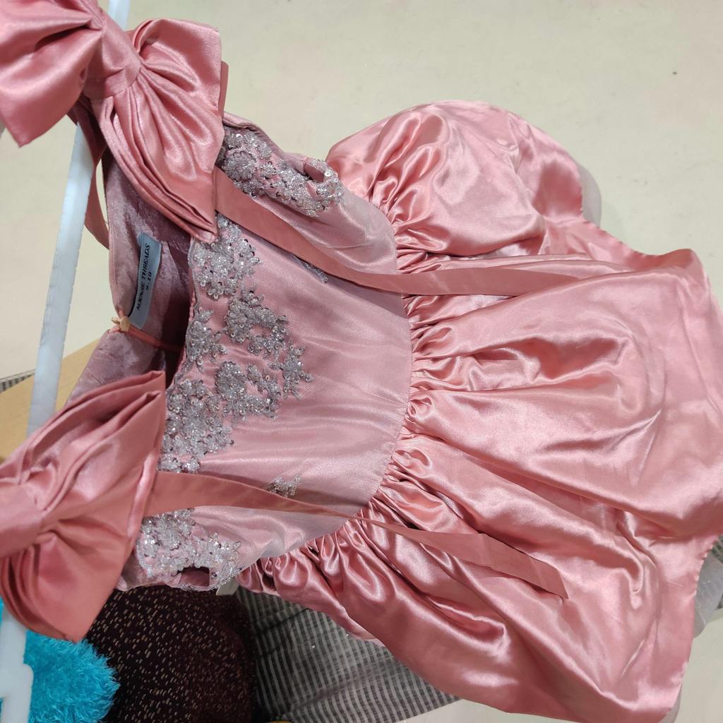 Description: Peach pink Italian silk frock with a cut daana bodice, net layers, and ribbon-tied bows. Includes soft lining—ideal for formal and semi-formal events.