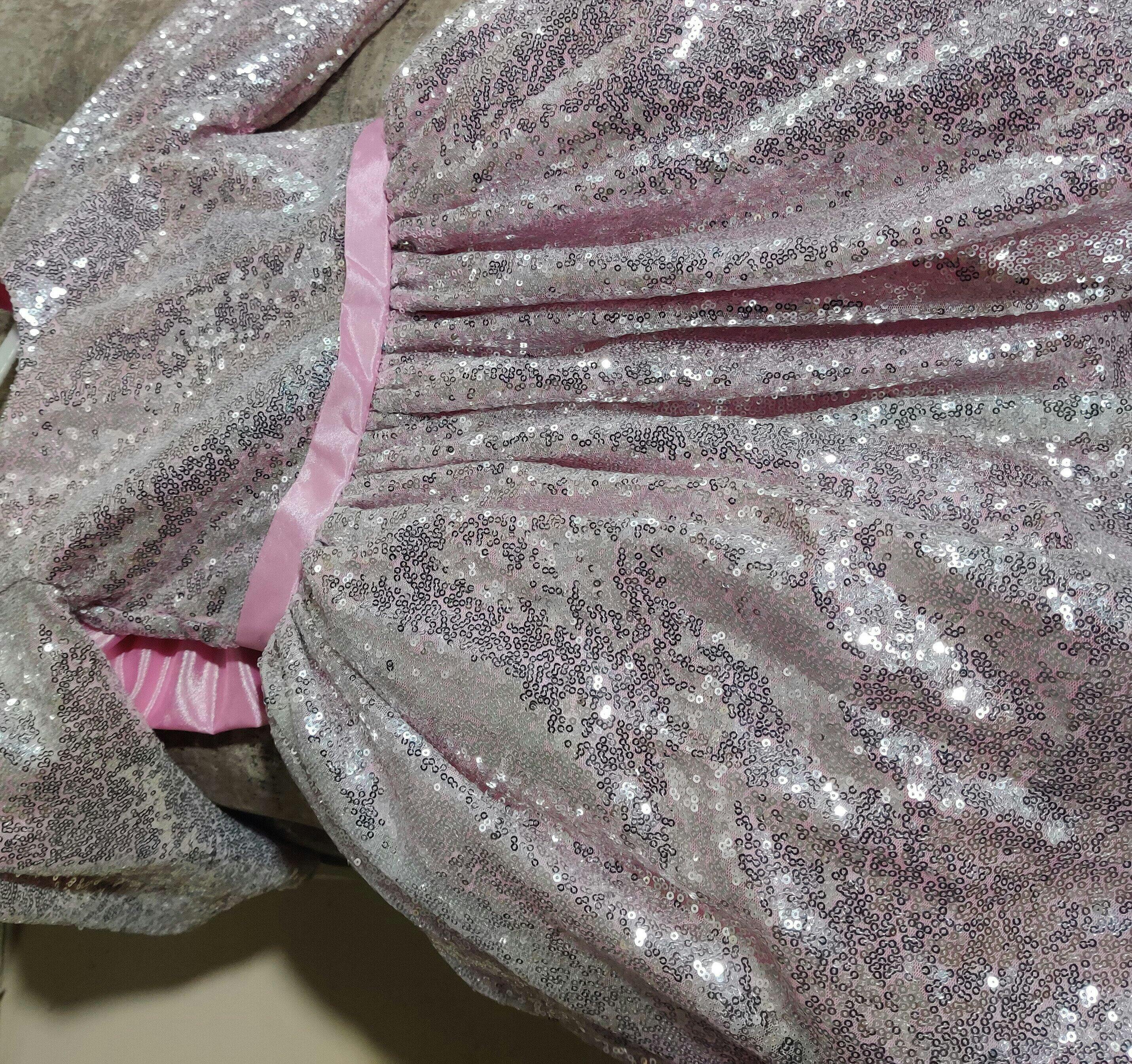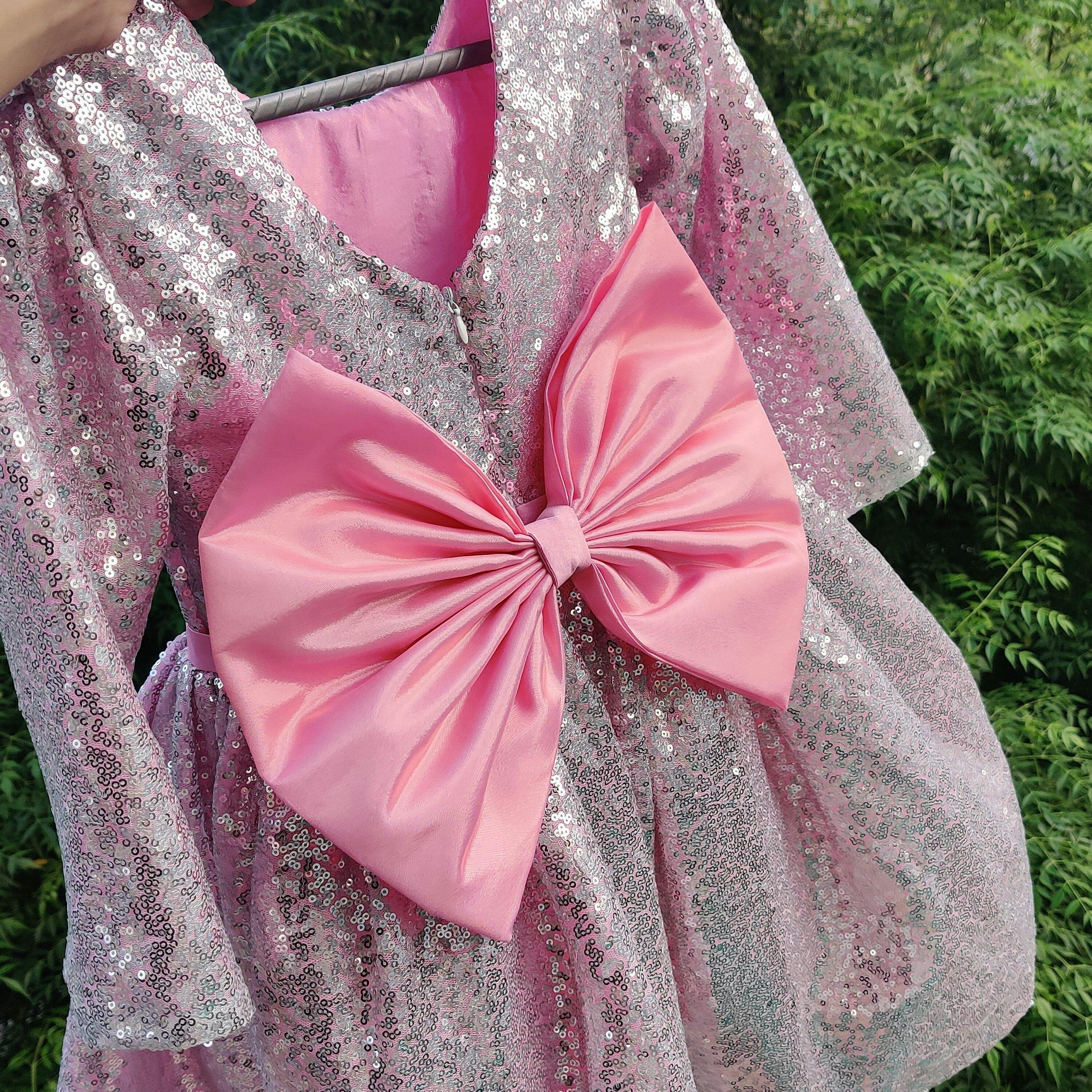 Description: A reflective pink frock with white sequin overlay, pink silk lining, long sleeves, and a satin waist belt—ideal for parties and special occasions.