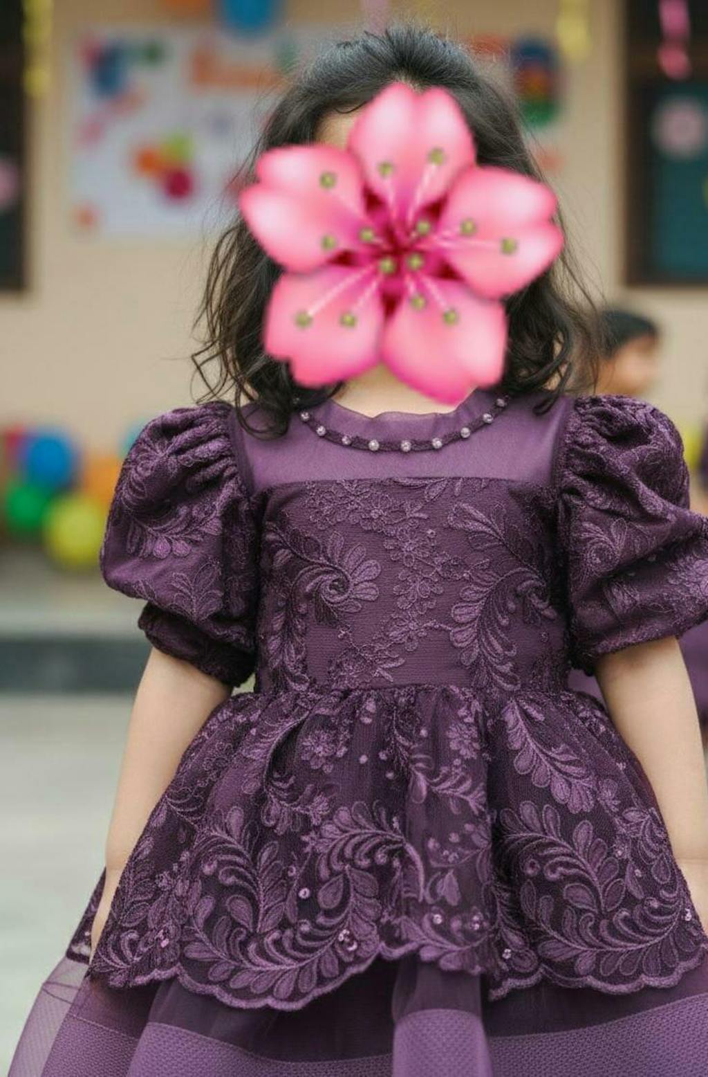 Description: A Plum embroidered net frock with puff sleeves, layered tulle skirt, and soft silk lining—ideal for birthdays and special celebrations.