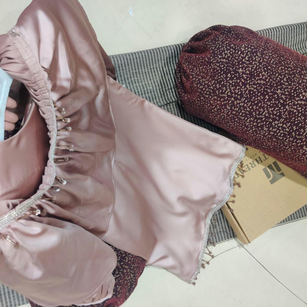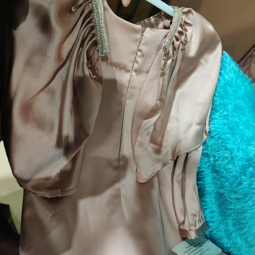 Description: A rose gold premium silk top with a matching shoulder cape, featuring pearl lace detailing and soft lining for added comfort. Ideal for formal and evening wear.