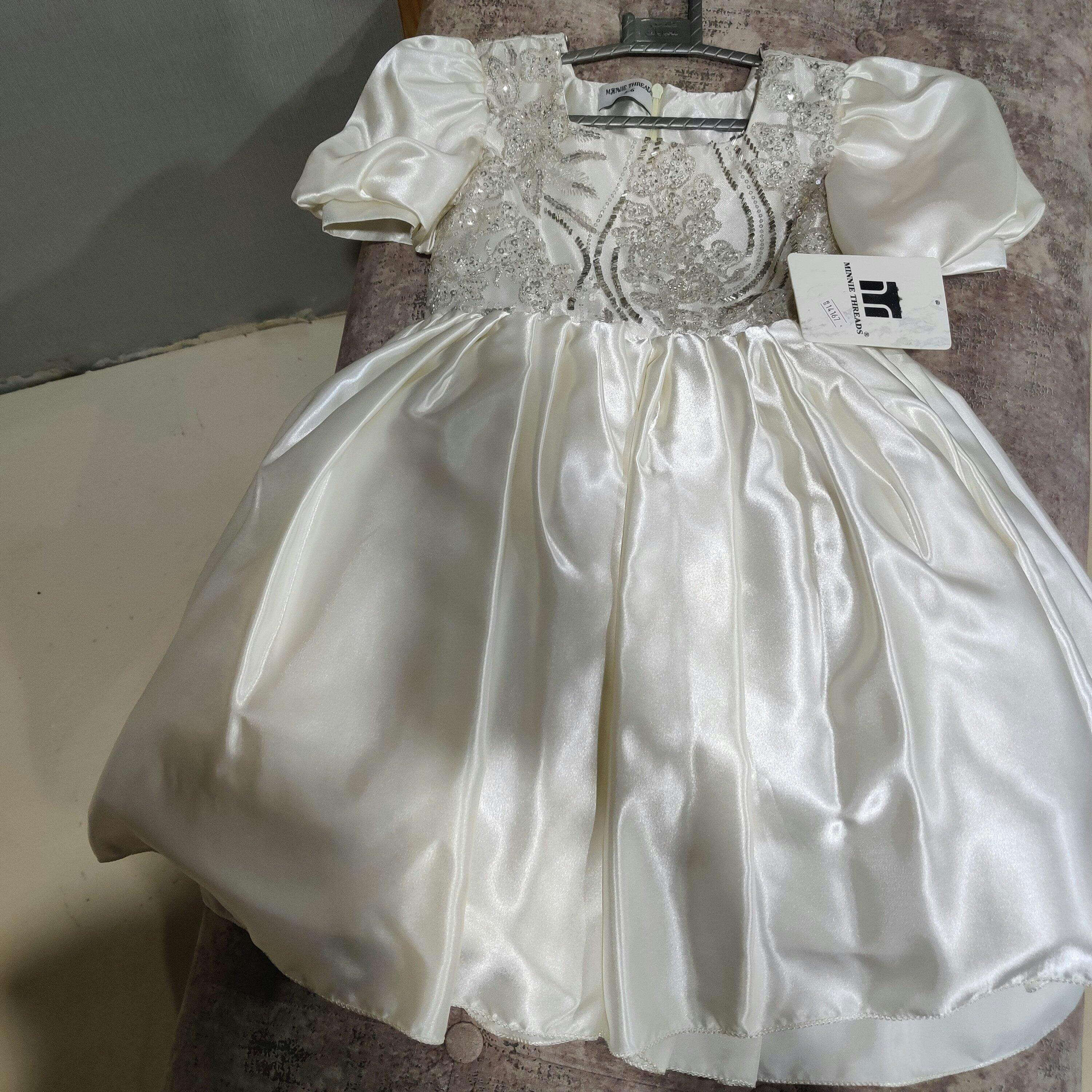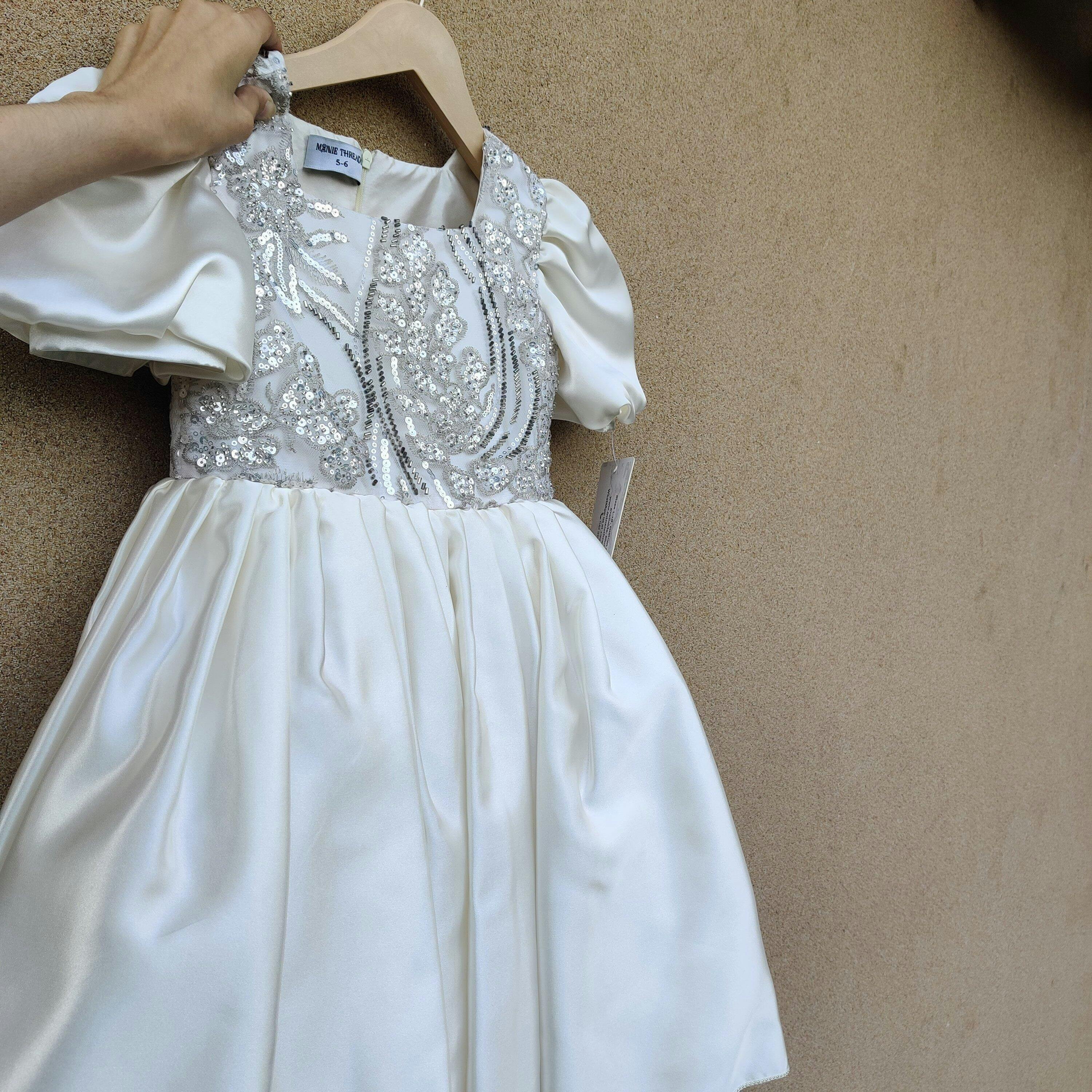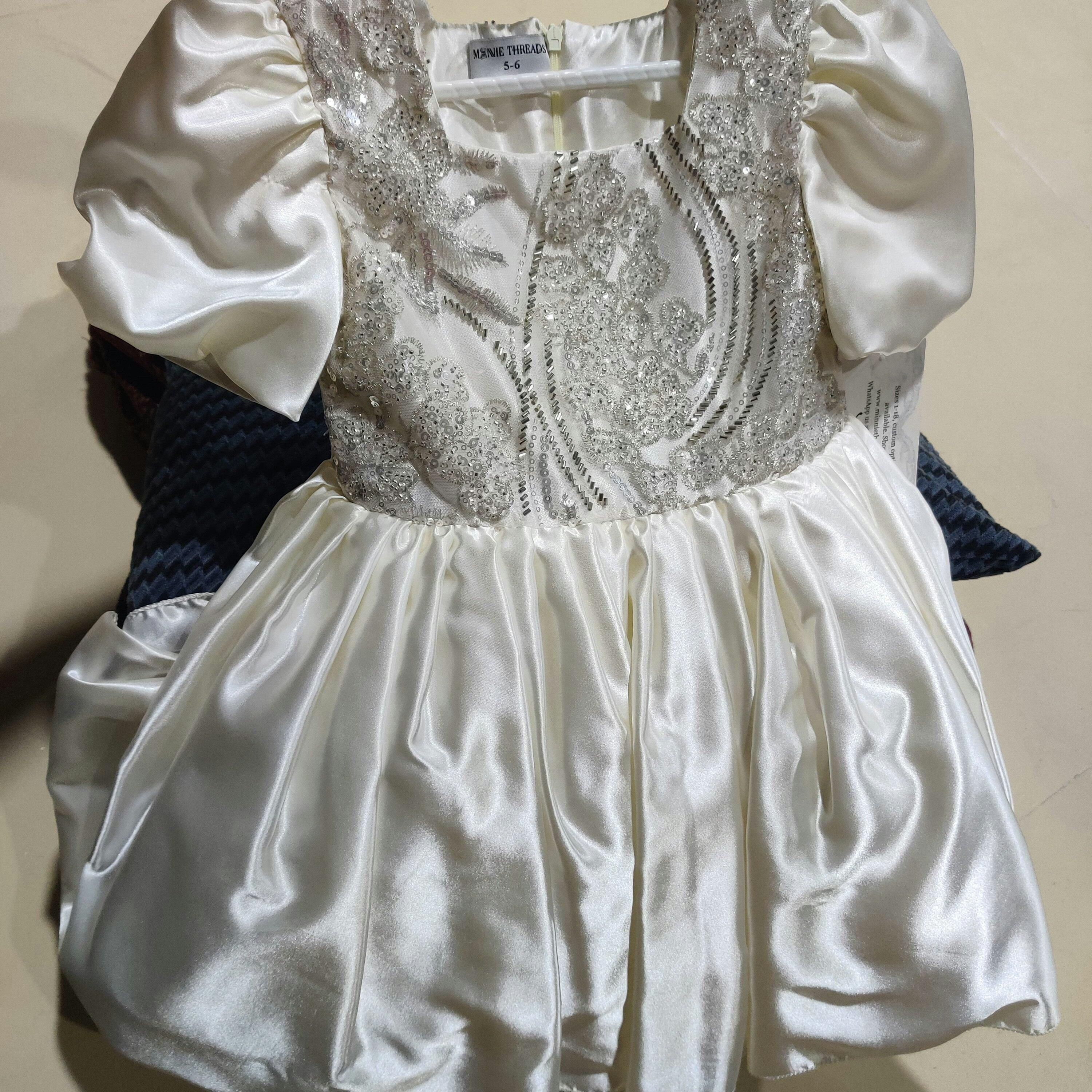 Description: An off-white frock crafted from premium silk and net cut daana, featuring a detailed bodice, puff sleeves, and a full knee-length skirt with soft silk lining. Perfect for festive and formal occasions.