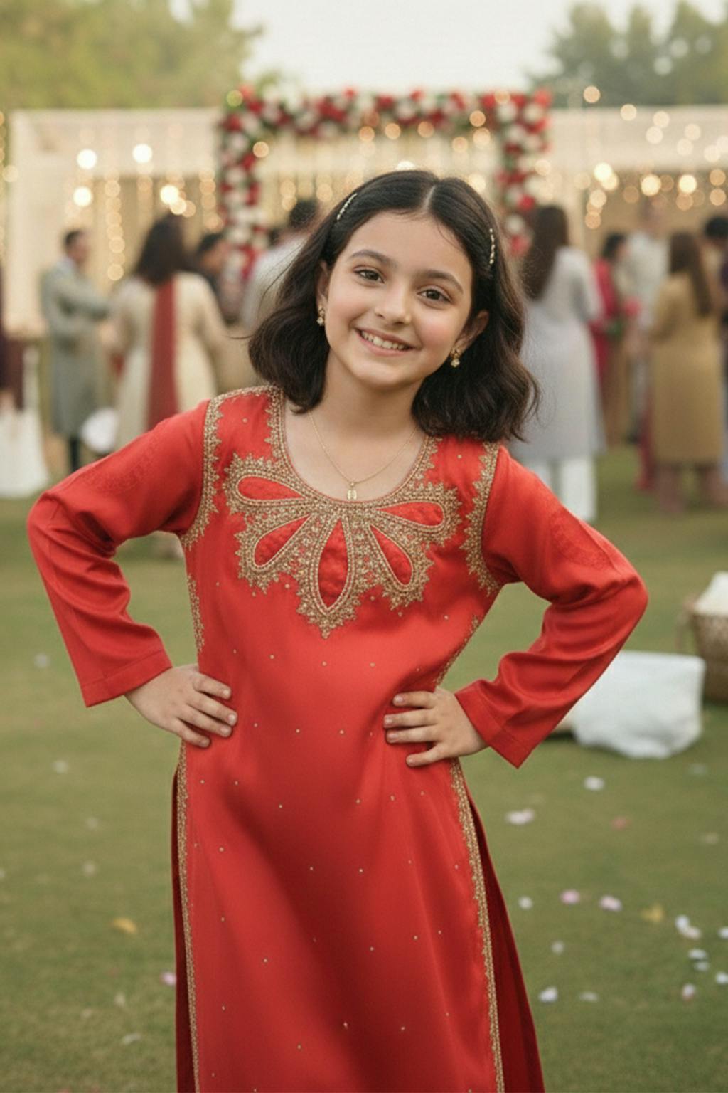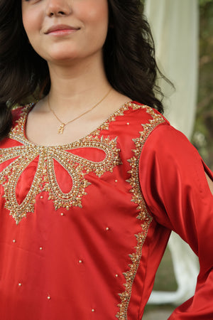 Shirt: A rich red Korean silk long shirt featuring intricate adda work (dabka, zardosi, naqshi, and stone work) on the side fittings and daaman. The scalloped loops neckline is beautifully adorned with handmade kundan work, adding a regal statement.