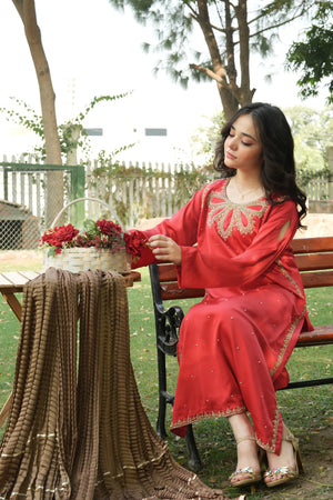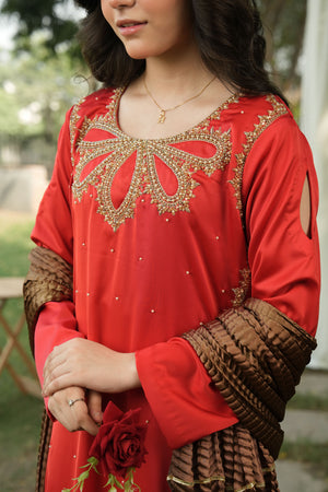 This ensemble captures timeless elegance with its rich red base and detailed gold craftsmanship. The statement neckline and coordinated bronze dupatta make it perfect for festive gatherings and formal occasions.