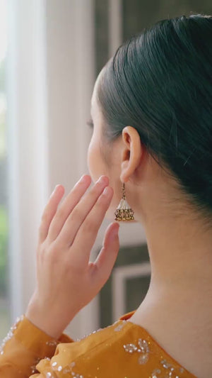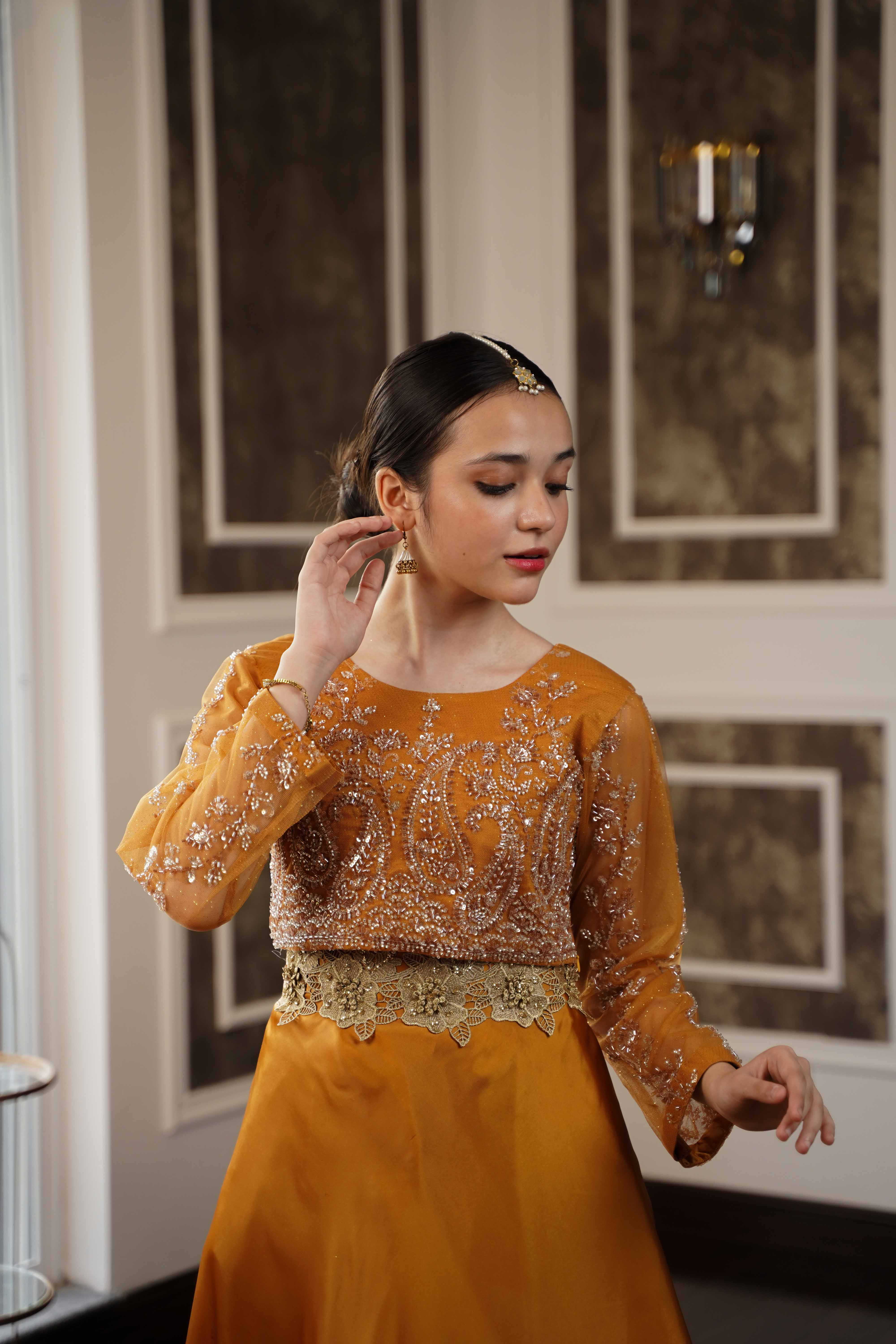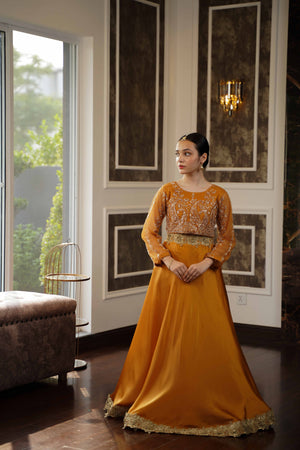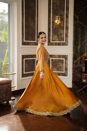 Description: A mustard yellow lehenga choli with heavy cut daana embroidery and floral lace detailing. Designed for weddings and festive celebrations.