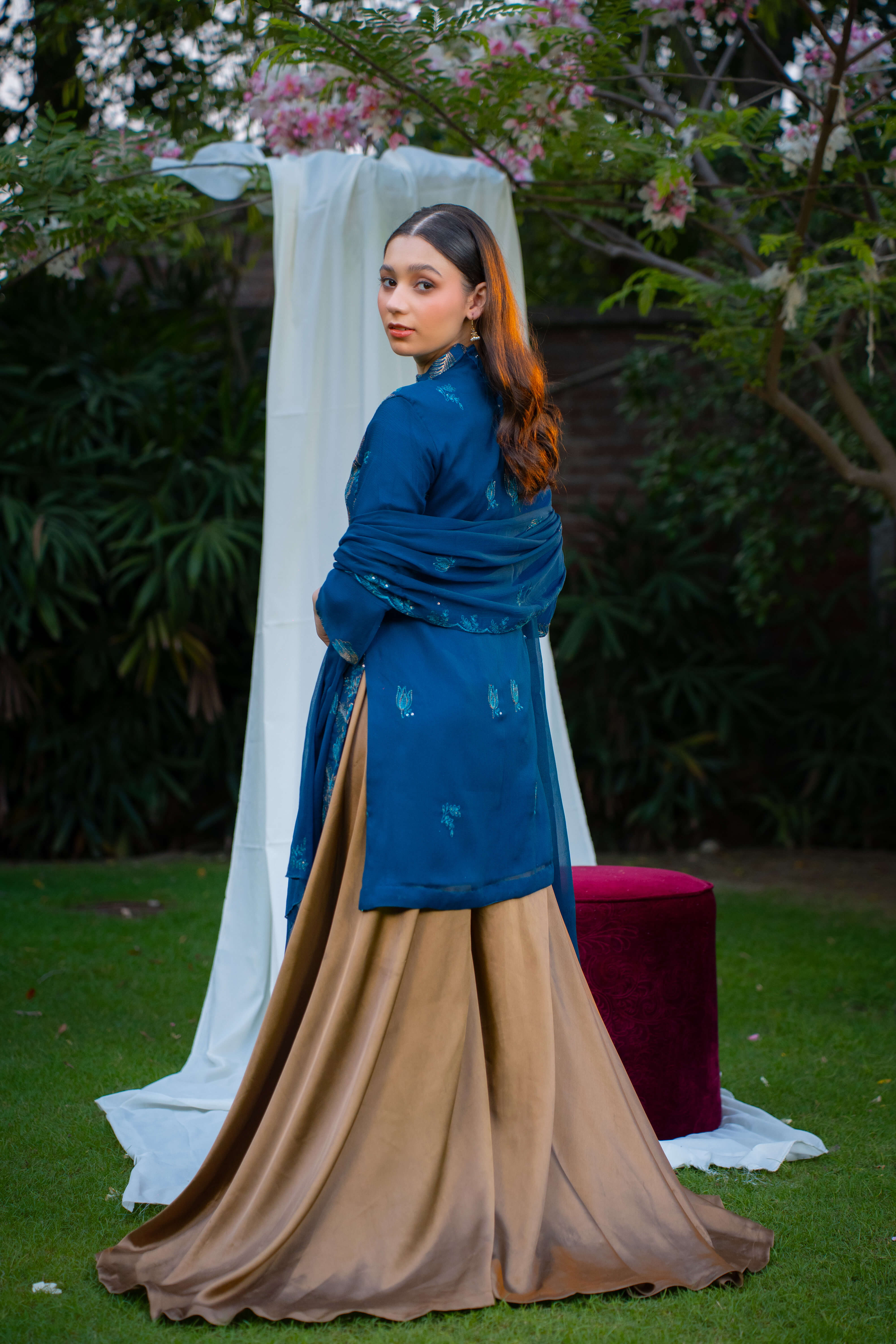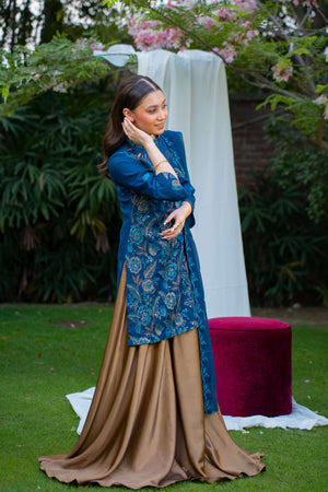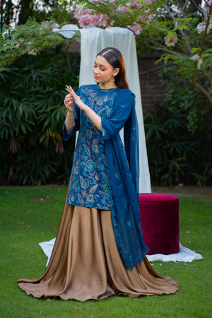 Zerifé is a sophisticated zinc-toned ensemble featuring a chiffon kurti with a ban neckline and loop detailing, adorned with bronze floral thread embroidery all over. It is paired with a flared bronze silk sharara, adding richness and volume. A matching zinc chiffon dupatta with bronze embroidery along the borders completes the look, offering a perfect blend of elegance and regality for festive occasions.
