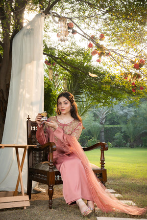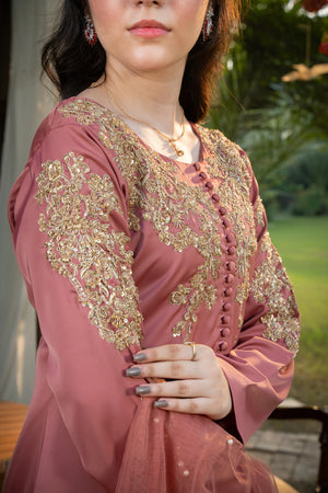 Shirt: A long rose pink shirt featuring elegant matte button detailing on the chest. The shirt is beautifully adorned with intricate light gold adda work motifs on both upper sleeves and chest sides. The embellishments include dabka, salma, naqshi, and stone detailing, enhancing its refined and graceful appeal.